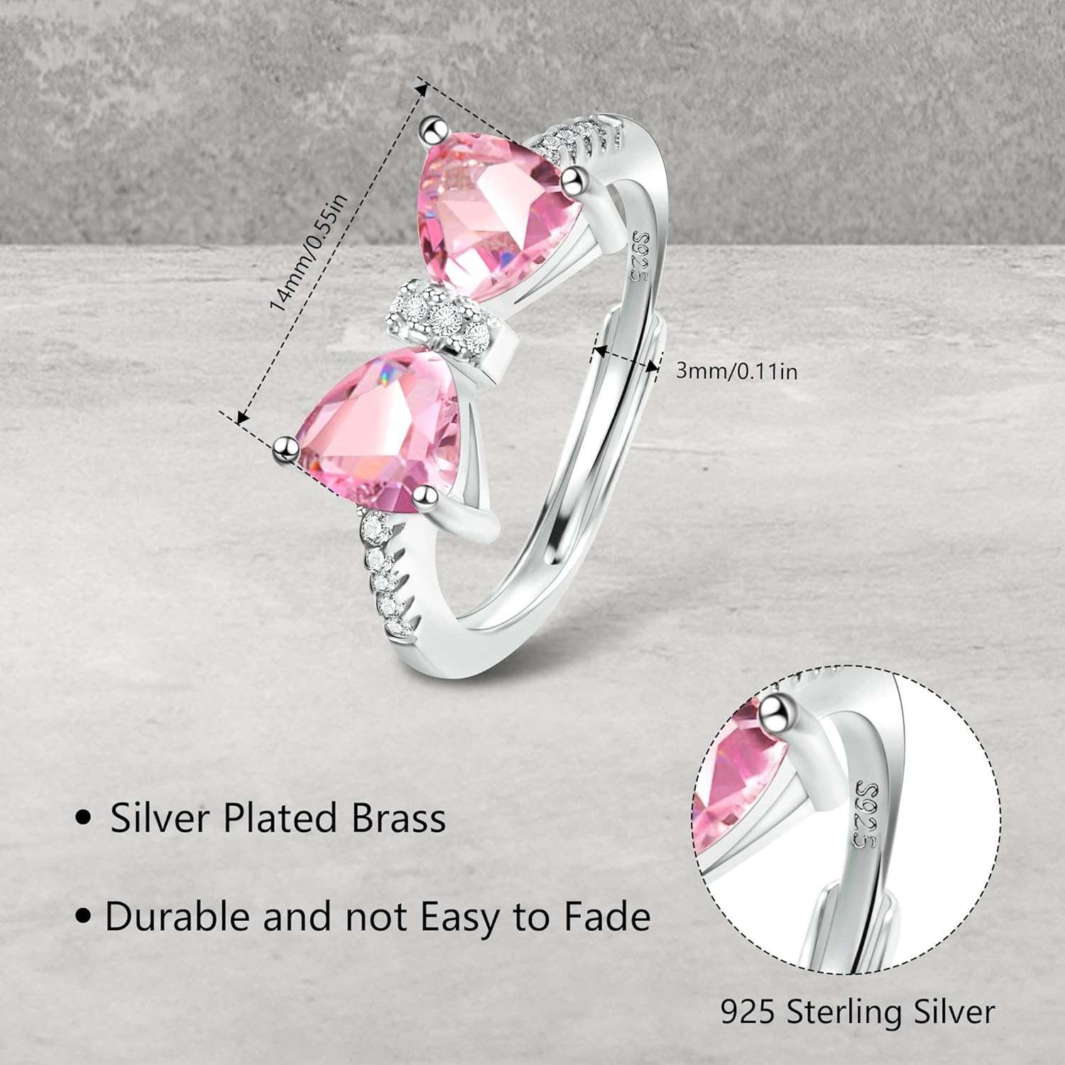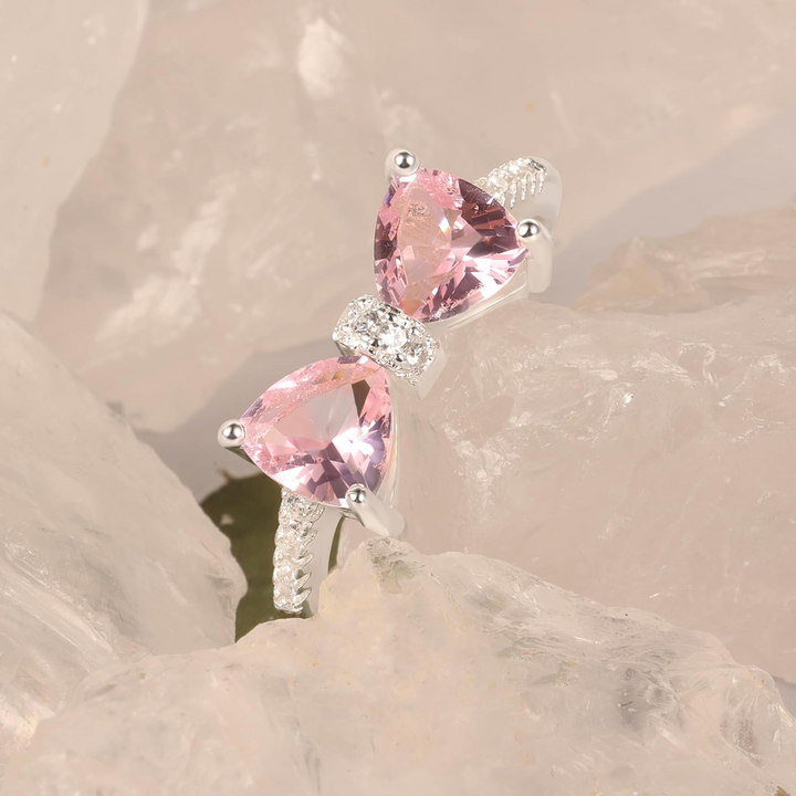 Crafted from sterling silver with white gold plating. Designed as a bow ring. Adorned with shimmering Cubic Zirconia stones.