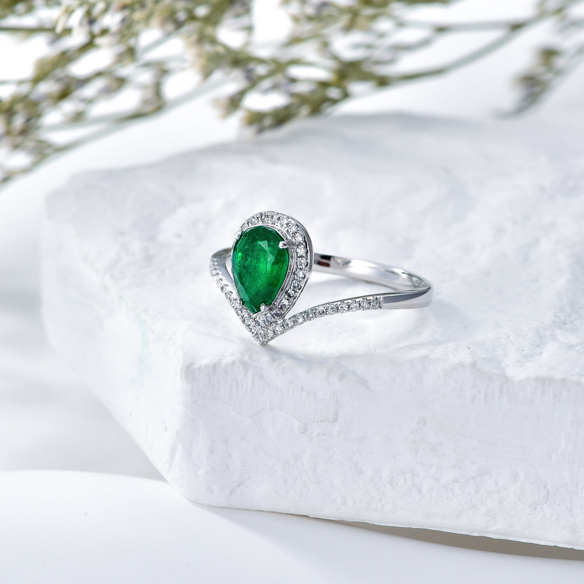 This 18K White Gold 2.5 to 7.5 CT.T.W. Pear Cut Emerald Custom Engagement Ring Anniversary Ring by YFN is a luxurious custom ring for the modern woman. Featuring a stunning pear-shaped design, this 18K Gold ring is adorned with lab-created diamonds and lab-created emeralds, with a striking center stone total weight of 2 to 7 CT and a total weight of 2.5 to 7.5 CT. Set in luxurious white gold, it's an unforgettable symbol of love.