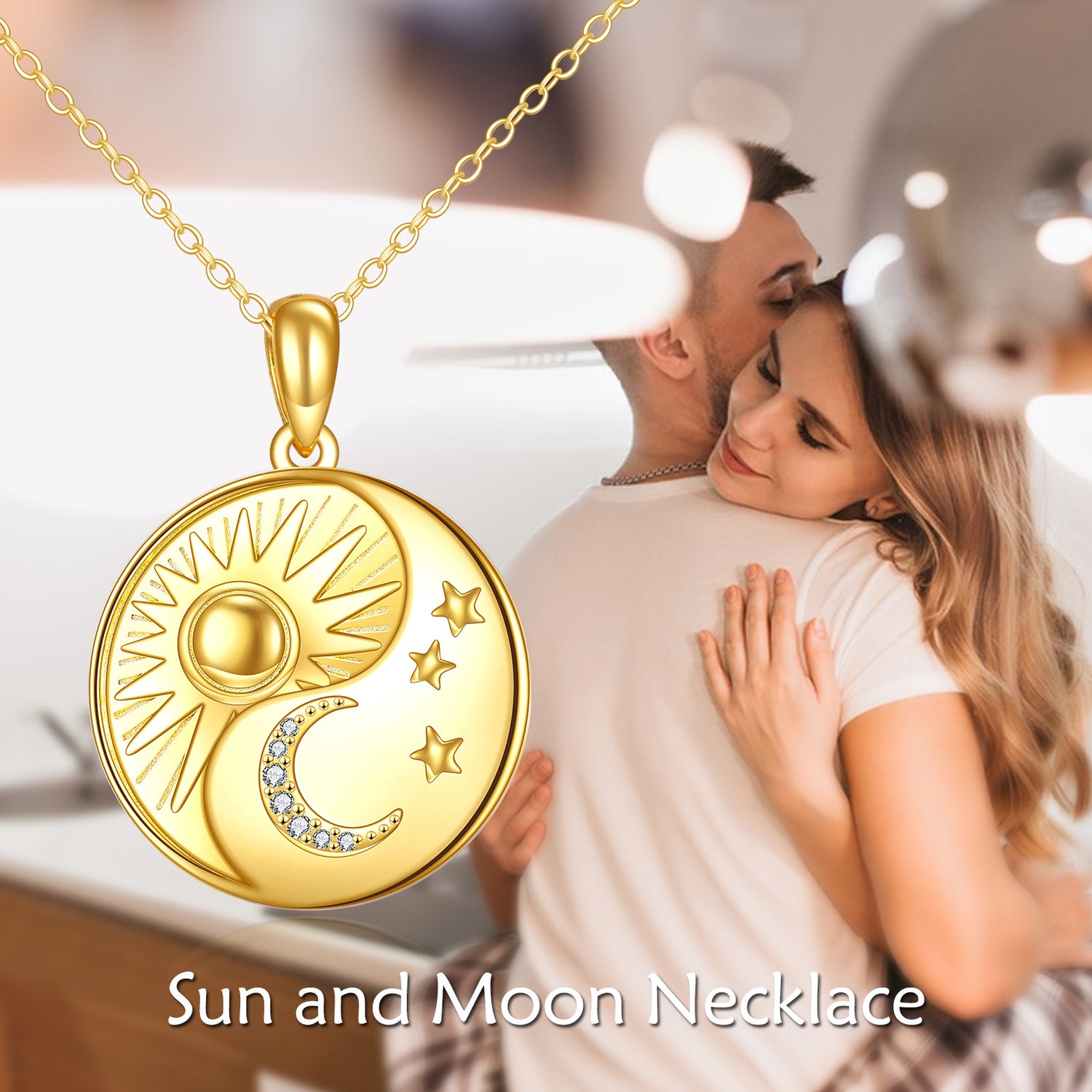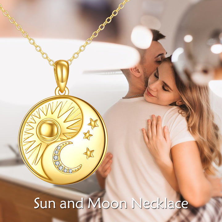 This circular pendant necklace is crafted from sterling silver with yellow gold plating (vermeil). It features a moon, star, and sun motif set with Cubic Zirconia stones.