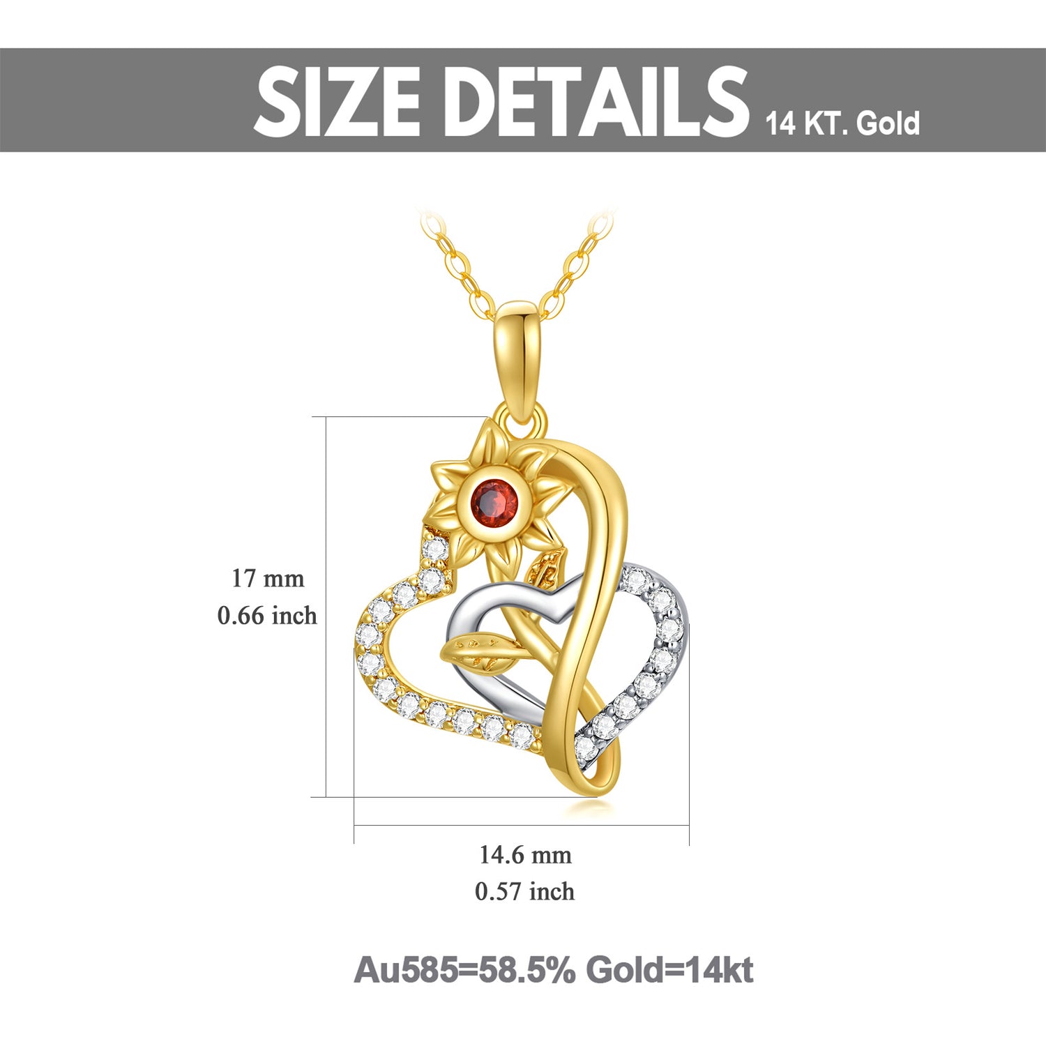Crafted in 14K gold with two-tone finish options. Features round red moissanite stone. Sunflower and interlocking heart motifs. Includes chain.