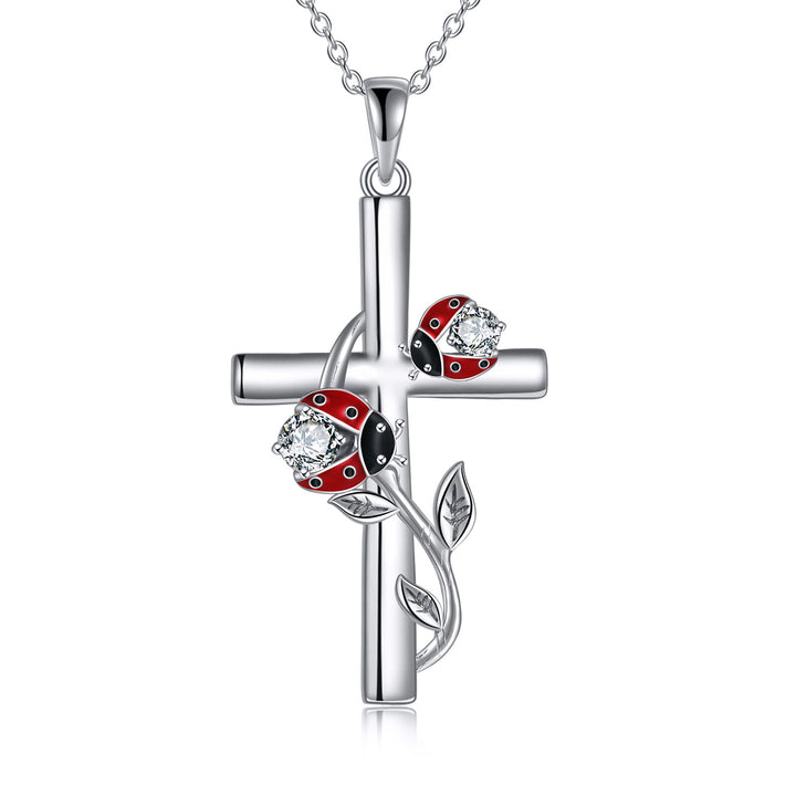 Sterling Silver Cubic Zirconia Ladybug & Cross Pendant Necklace