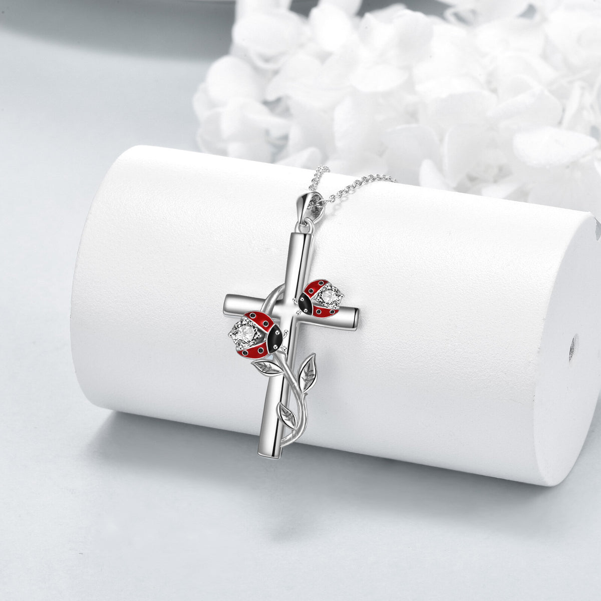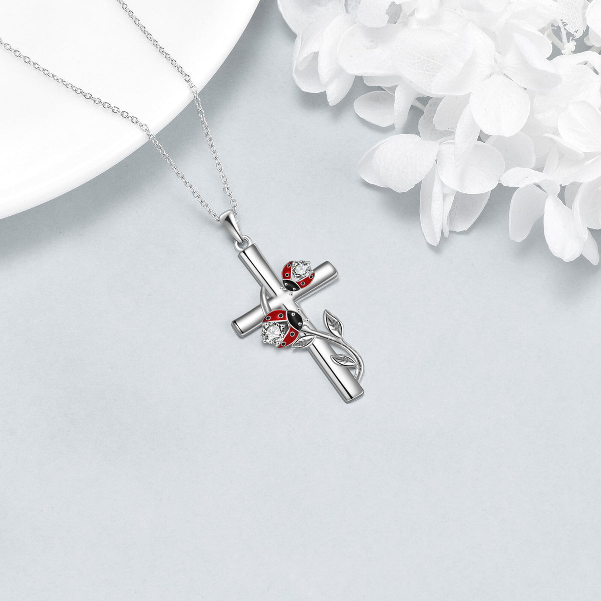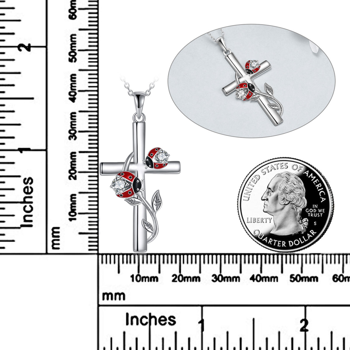 Sterling silver with white gold plating; cubic zirconia; ladybug and cross motifs; silver chain.