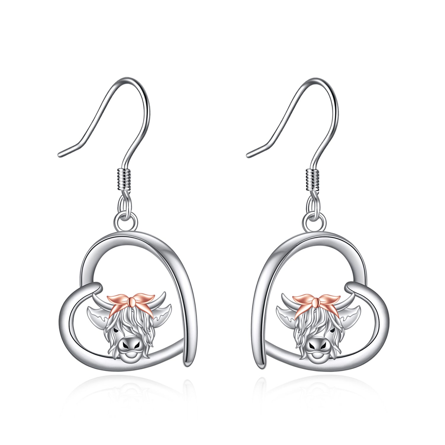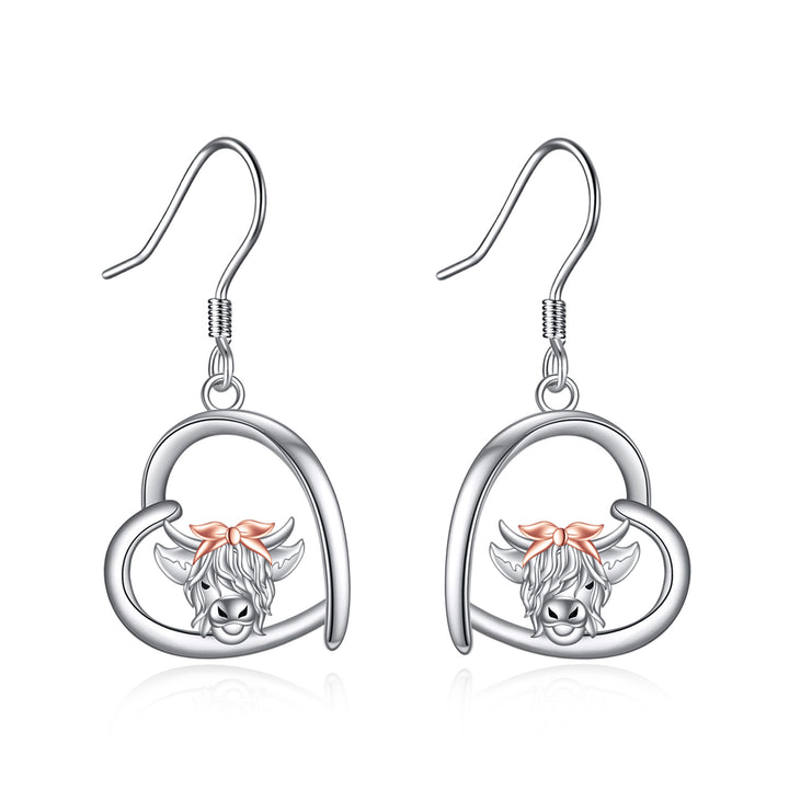These stone-free Drop Earrings are crafted from Premium Sterling Silver with Silver and Rose Gold accents, featuring a Highland Cow and Heart motif.
