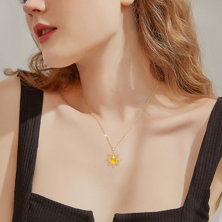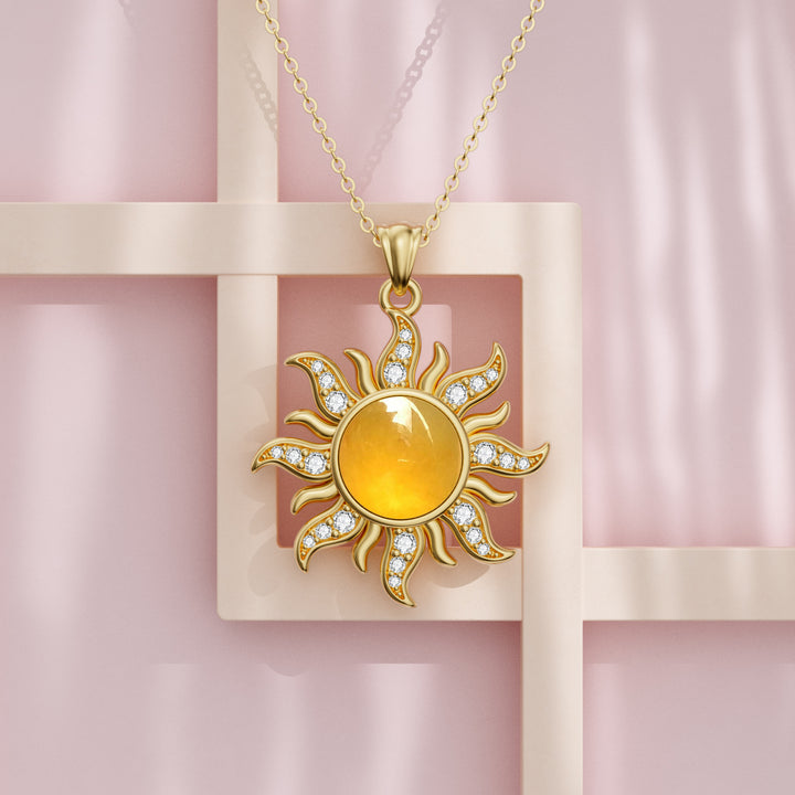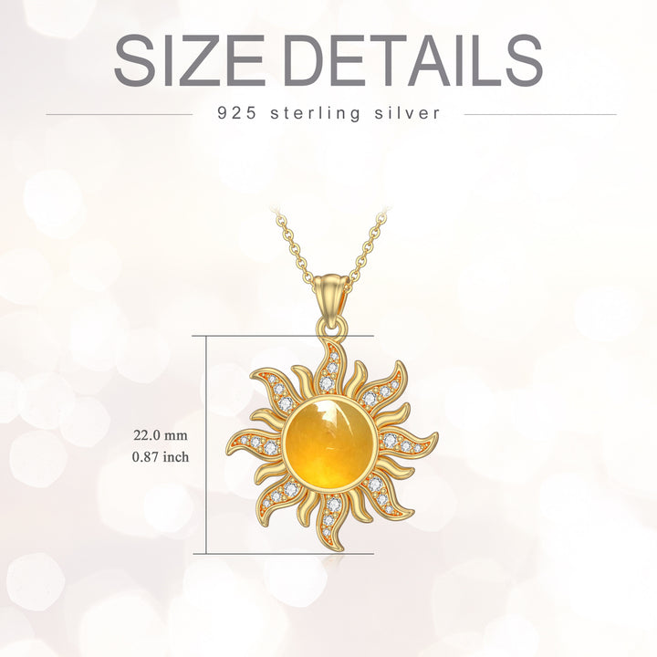 This Pendant Necklace is crafted from High-Quality Sterling Silver and Adorned with a Captivating Sun-Shaped Yellow Jade Centerpiece, Elegantly Plated in 18K Yellow Gold.