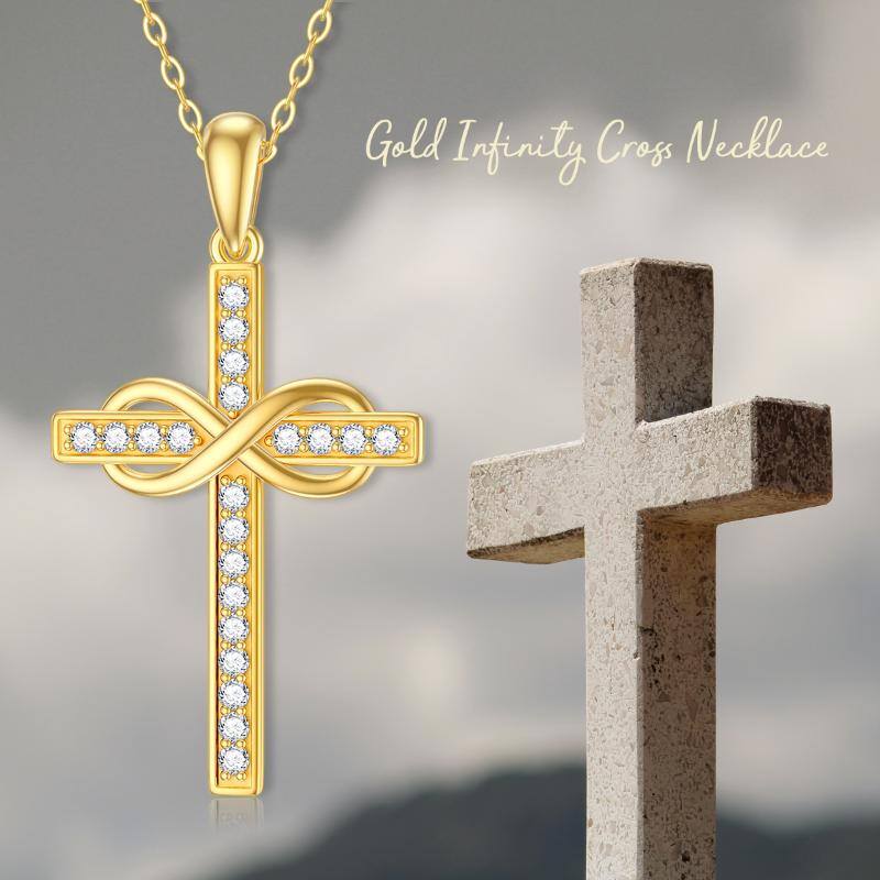 Crafted in 9K gold featuring a cubic zirconia centerpiece available in cross or infinity symbol pendant options. Includes standard necklace chain.