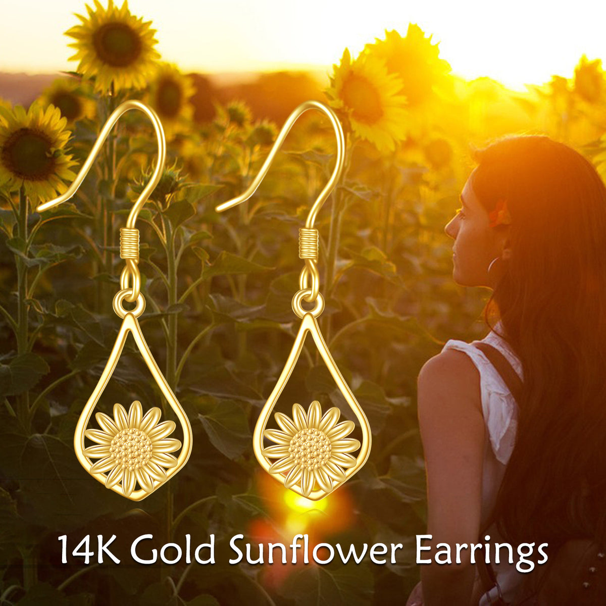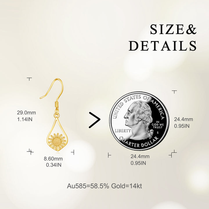 Crafted from solid 14K Gold. These are Drop Earrings featuring a Sunflower motif (no stones).