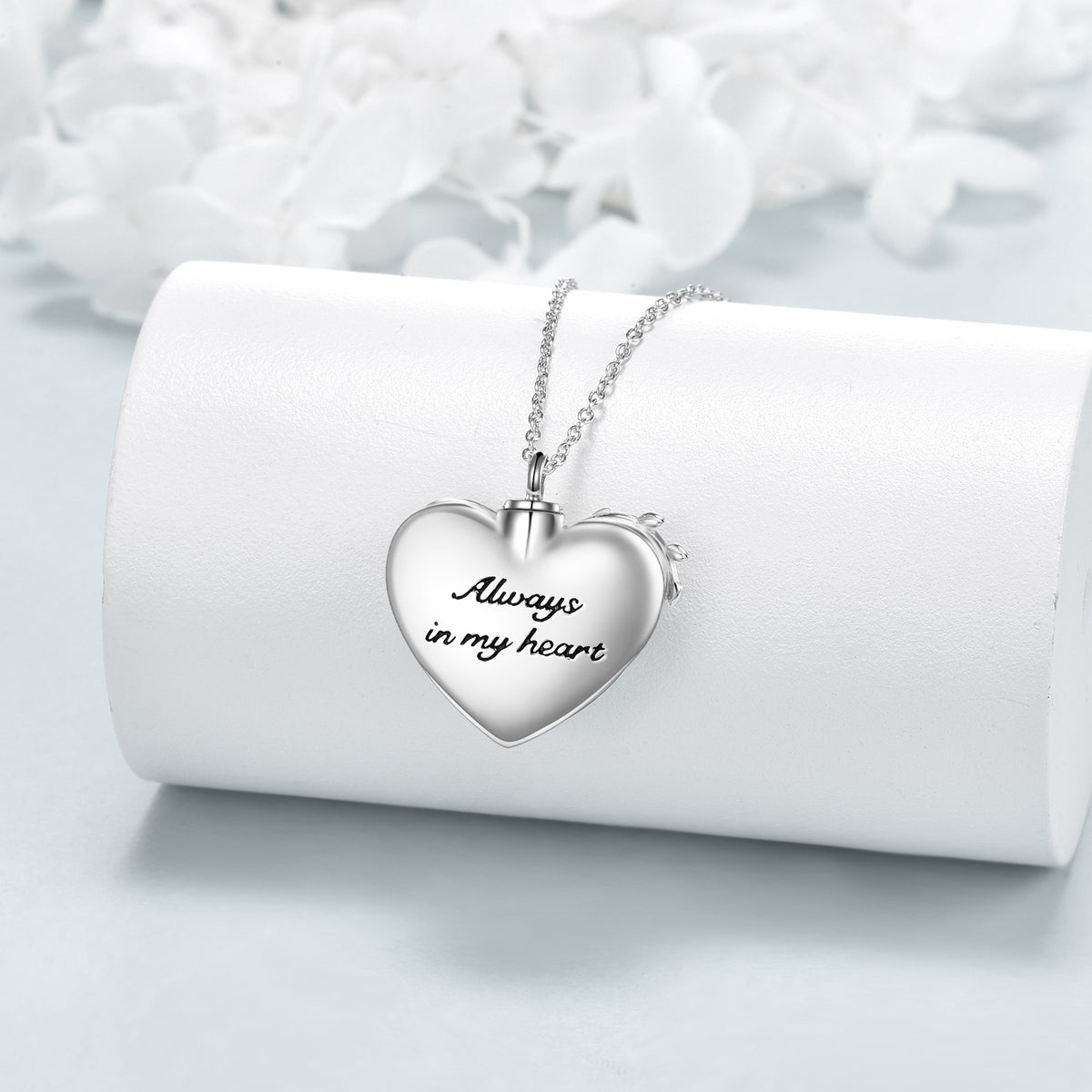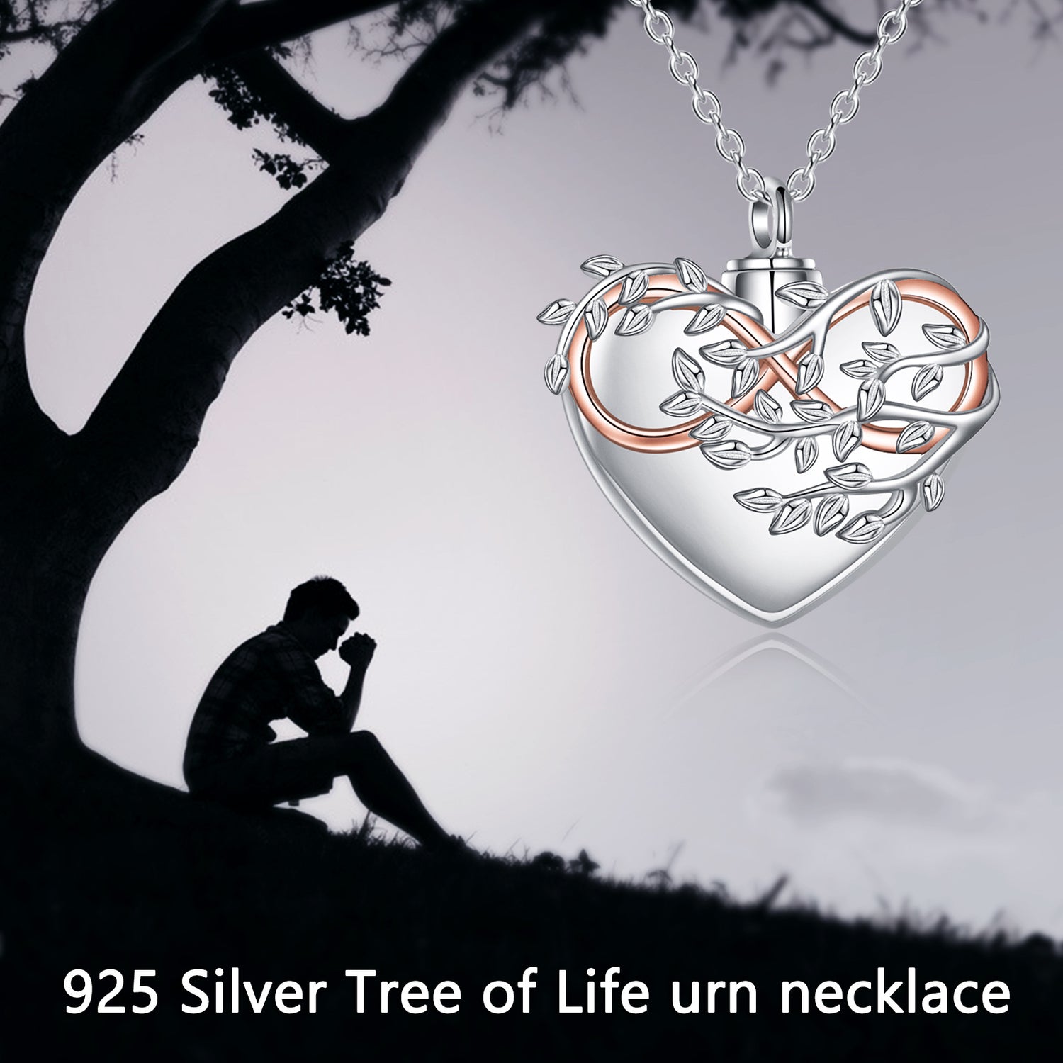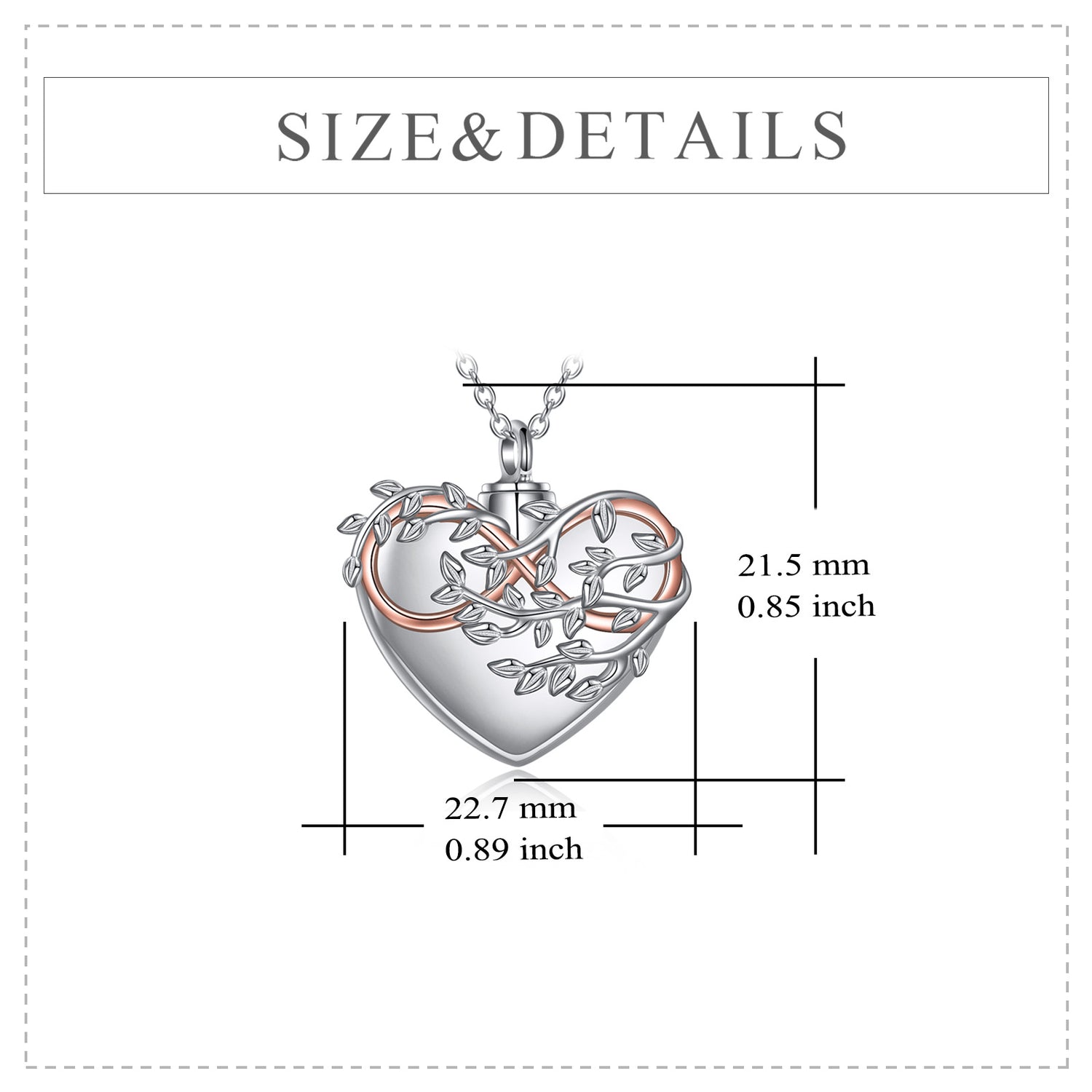 This urn necklace for ashes is made of Sterling Silver with a Silver & Rose Gold two-tone finish. It features stone-free Tree Of Life, Heart, and Infinity Symbol motifs, and the inscription "Always in My Heart."