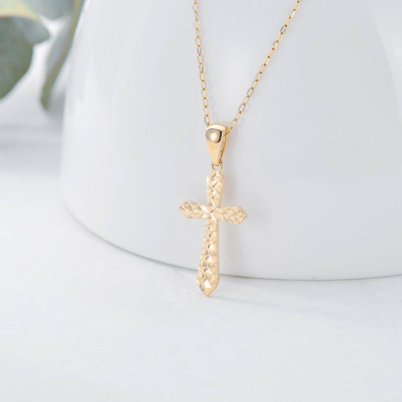 This pendant necklace is crafted from solid 9K Gold in a high-polish, stone-free cross design, suspended from a gold chain.