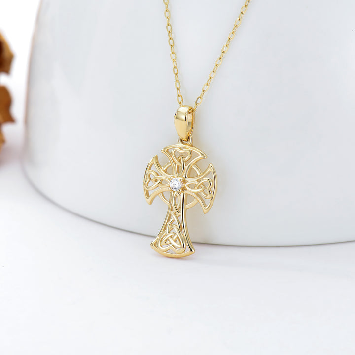 This Pendant Necklace is Designed in Lustrous 14K Gold, featuring a Radiant Cubic Zirconia Centerpiece and an Intricate Celtic Knot Cross Design.
