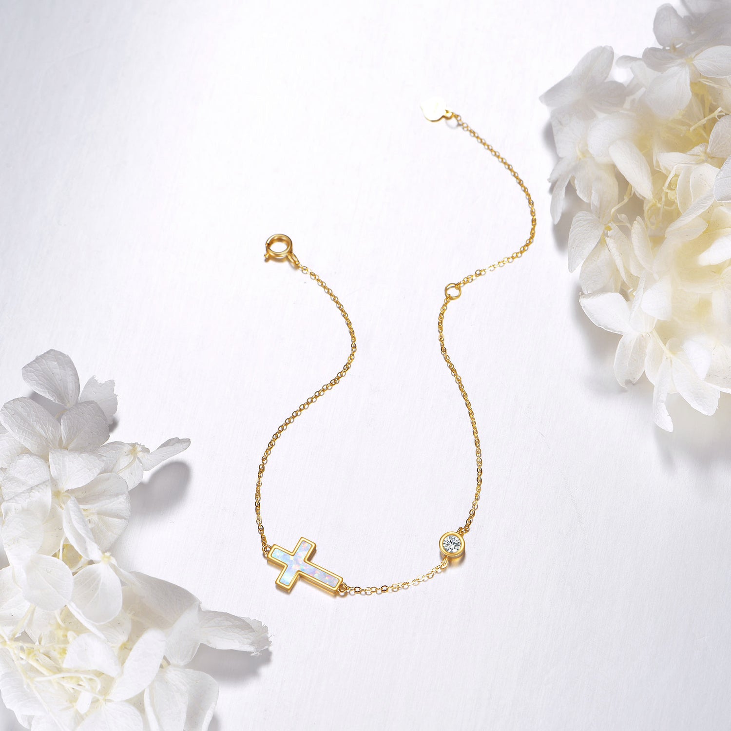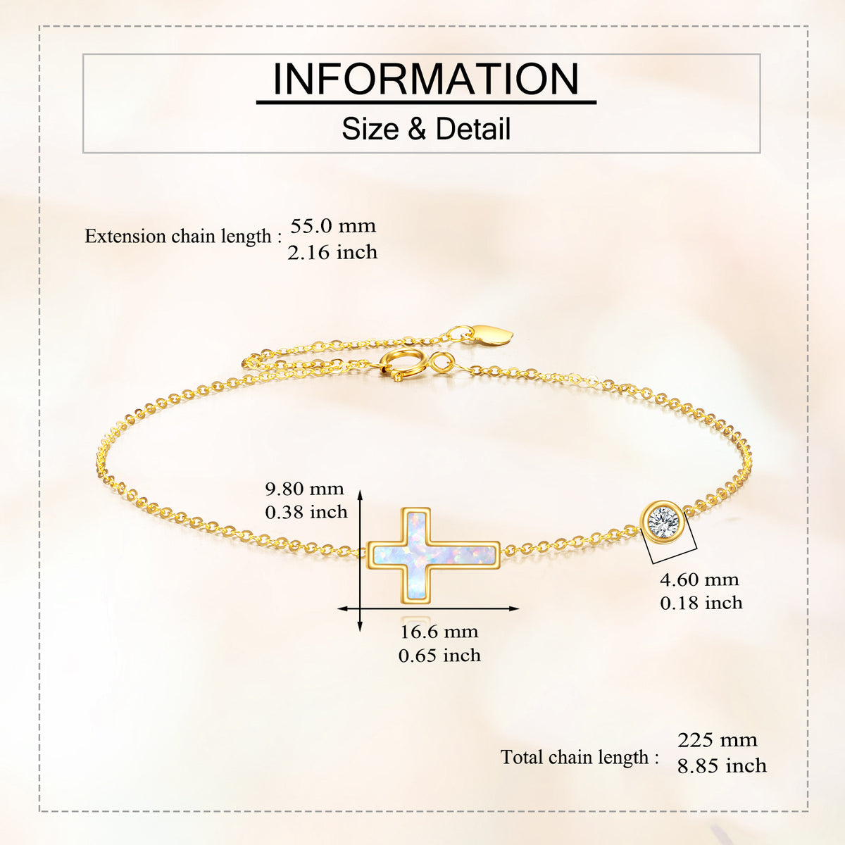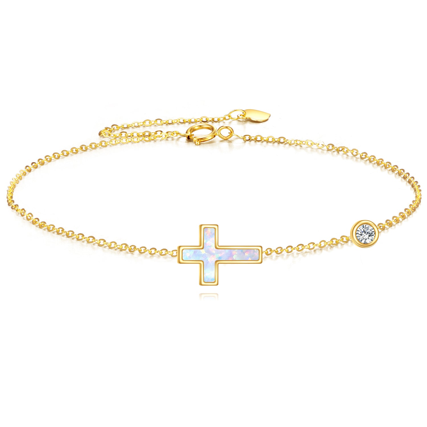 Crafted in 14K gold. Features moissanite and opal stones with cross and round charm details. Includes bracelet chain.