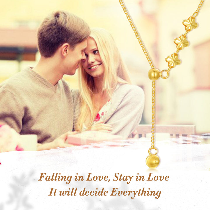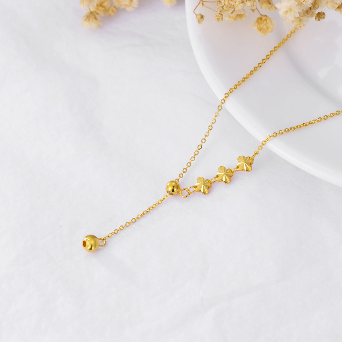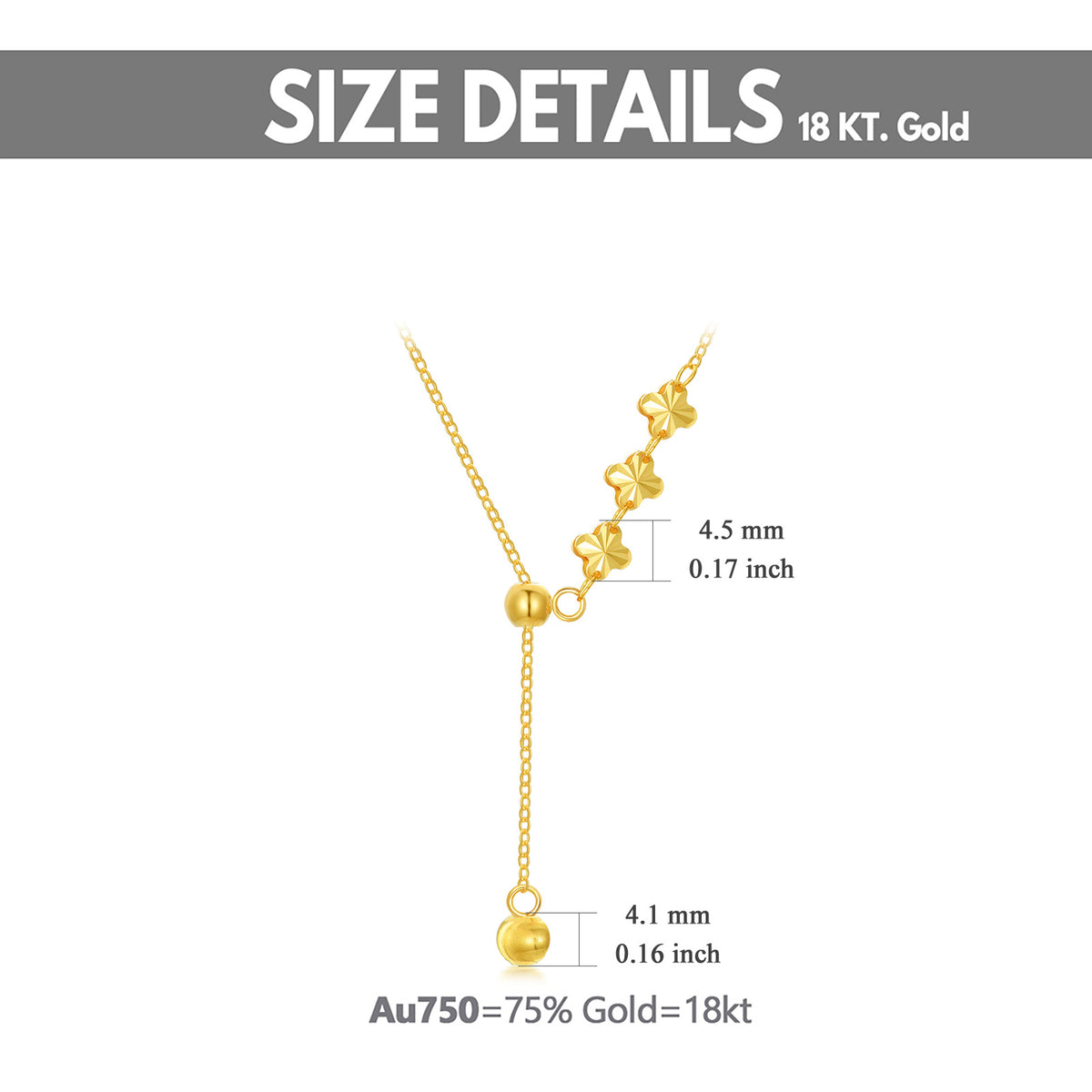 Crafted from 18K solid gold. Features an adjustable Y-style chain. Accented with a delicate four-leaf clover bead charm. Secured with a durable, adjustable clasp mechanism.