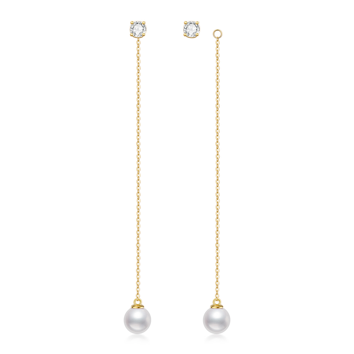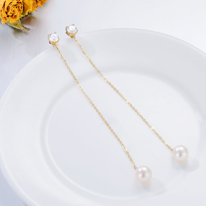 These Women's Drop Earrings are Crafted from Premium 14K Gold, Adorned with Shimmering Moissanite Gems and Lustrous Round Pearls.