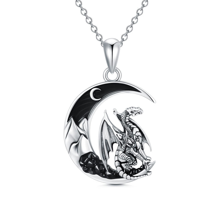 Crafted from high-quality Sterling Silver with a Retro Silver finish, this no-stone Pendant Necklace features an intricately detailed Dragon entwined with a Crescent Moon.