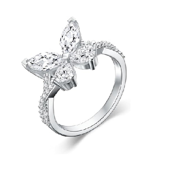 Crafted in sterling silver with white gold plating. Set with clear zircon stones. Features butterfly motif and polished band.