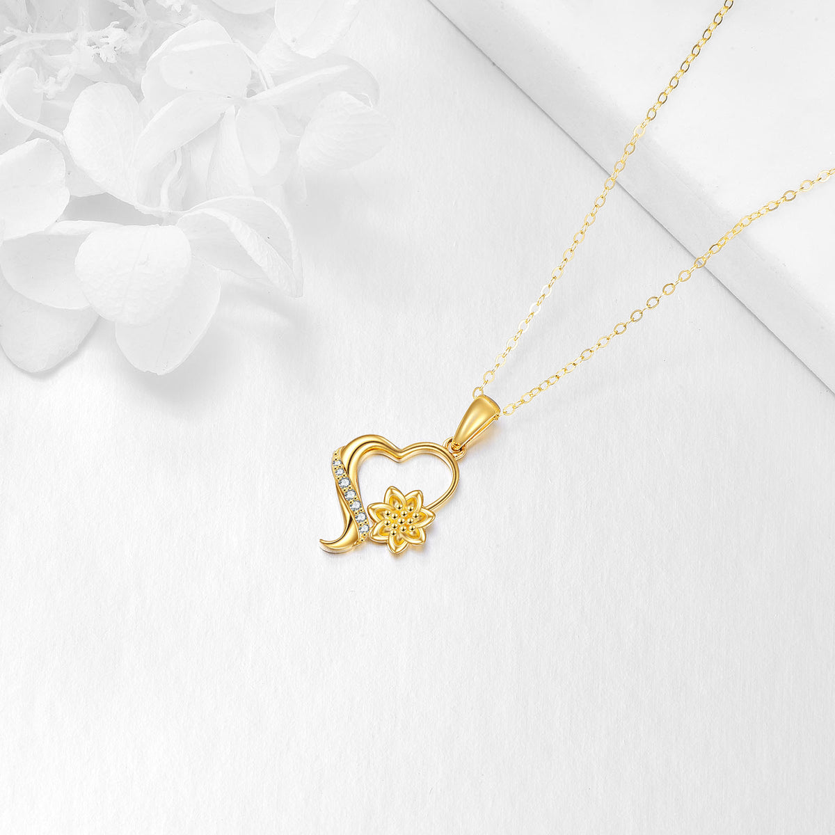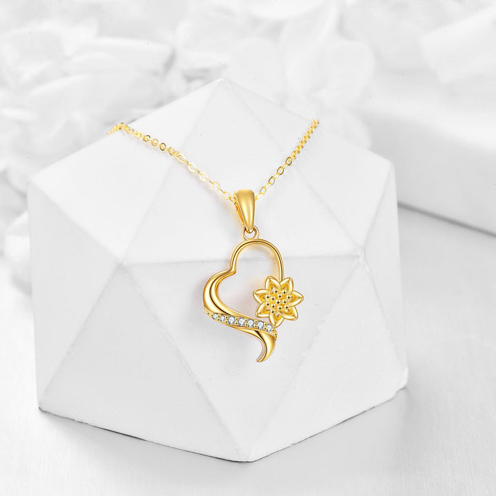 14K Gold Round Zircon Sunflower & Heart Pendant Necklace