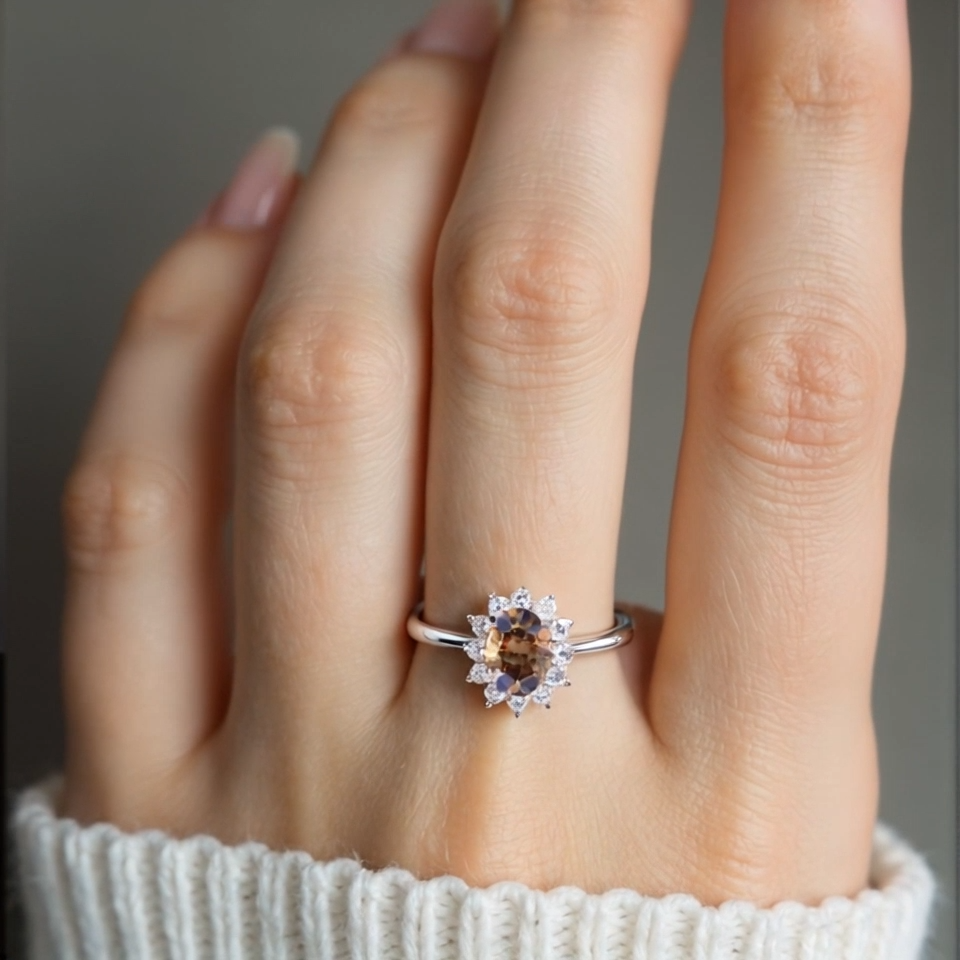Engagement ring crafted from solid 14K white gold, featuring an oval lab-created diamond center stone (0.5 to 3 CT) in Brown color, VVS1 clarity. Total weight 1 to 3.5 CT. IGI Certified. Available in standard US ring sizes 5 to 10.