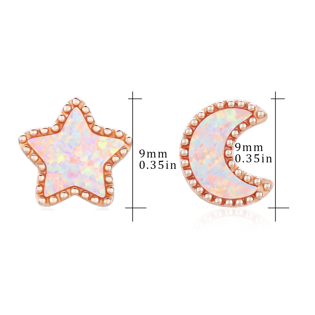 These Sterling Silver with Rose gold plated Opal Moon & Stars Stud Earrings by YFN are delicate stud earrings for women. Crafted from Sterling silver and beautifully Rose gold plated, they feature delicate Moon and star designs, offering a chic celestial elegance.