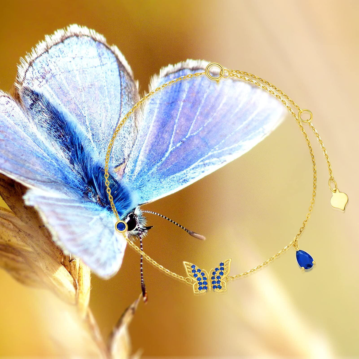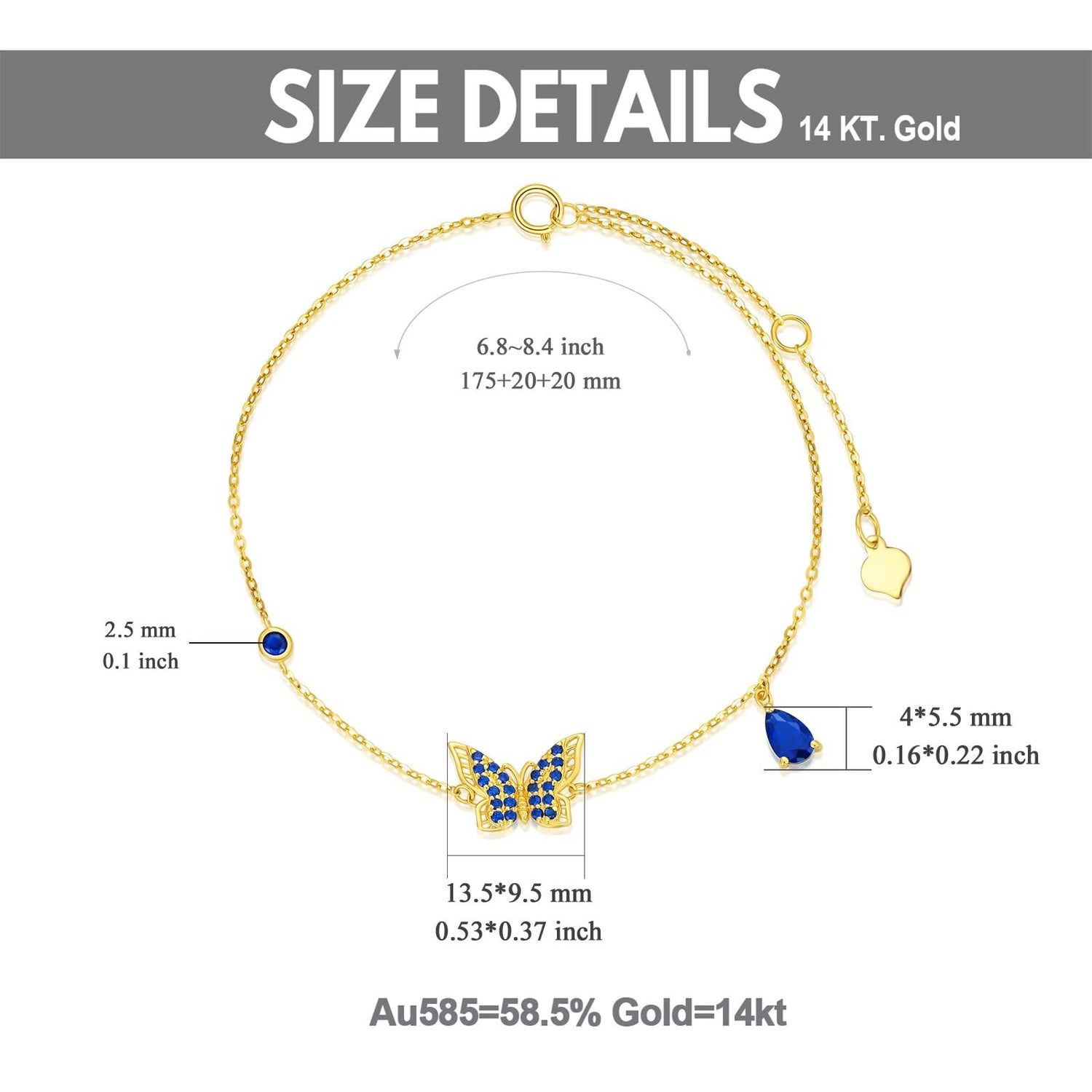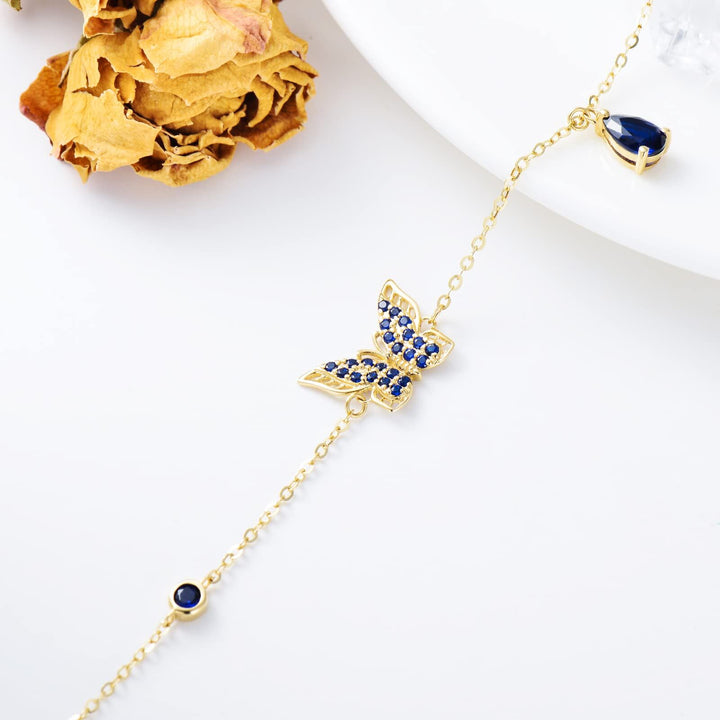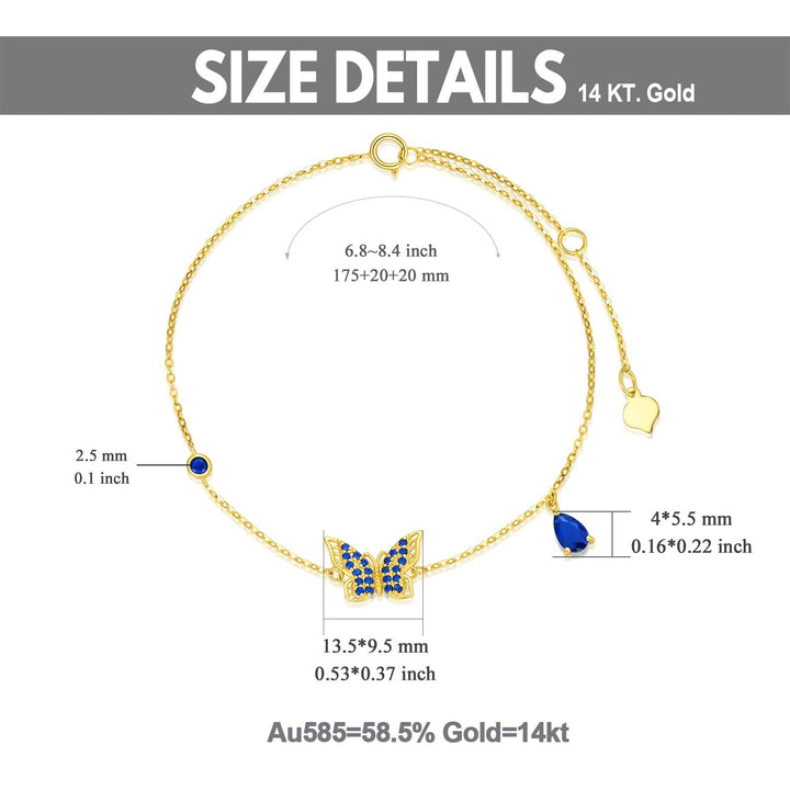 Crafted from Solid 14K Yellow Gold featuring a Butterfly charm set with blue Cubic Zirconia stones.