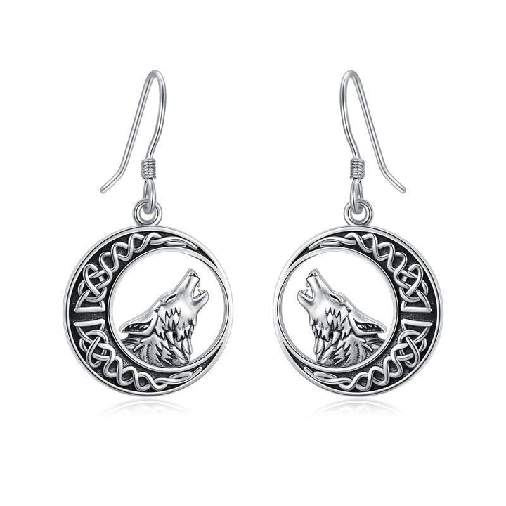 These no-stone Hoop Earrings are Crafted from High-Quality Sterling Silver with a Retro Silver Finish, featuring Wolf, Celtic Knot, and Moon Motifs.