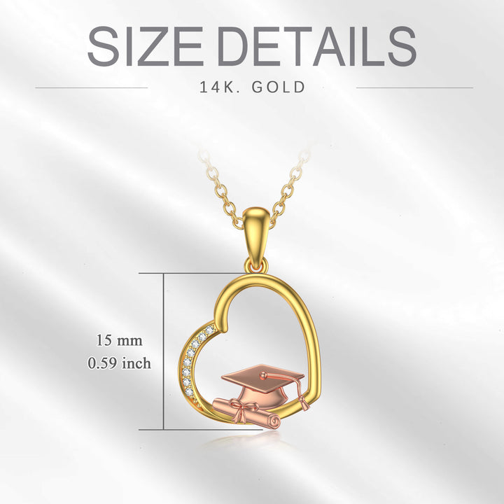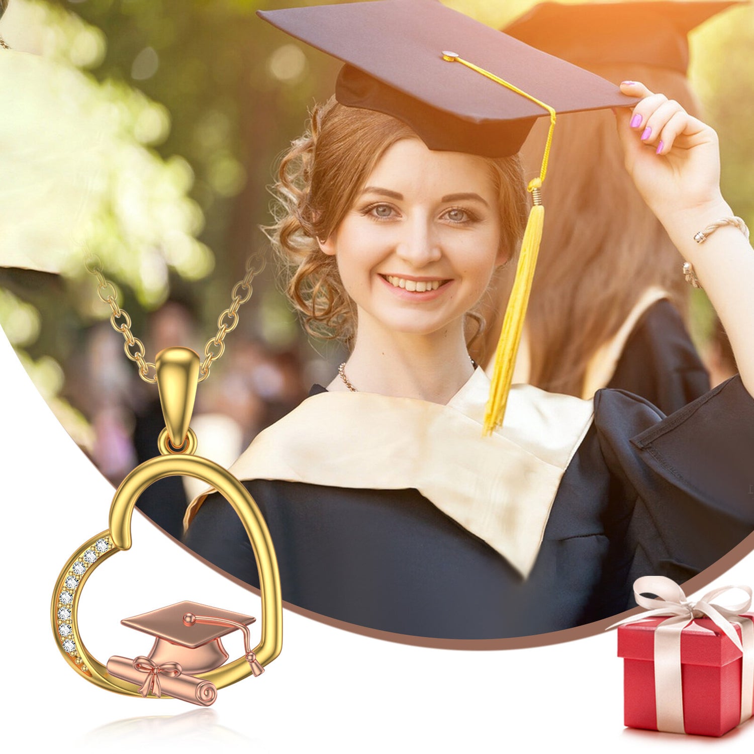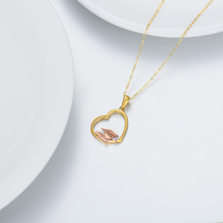 This 14K Gold and Rose Gold Zircon Heart and Trencher Cap Pendant Necklace by YFN blends heartfelt symbolism with a touch of accomplishment. The zircon-adorned heart represents love and connection, while the trencher cap design adds a celebratory note for life’s milestones. Available in classic gold or romantic rose gold, it offers women a refined, meaningful accent suited for marking special achievements with elegance.