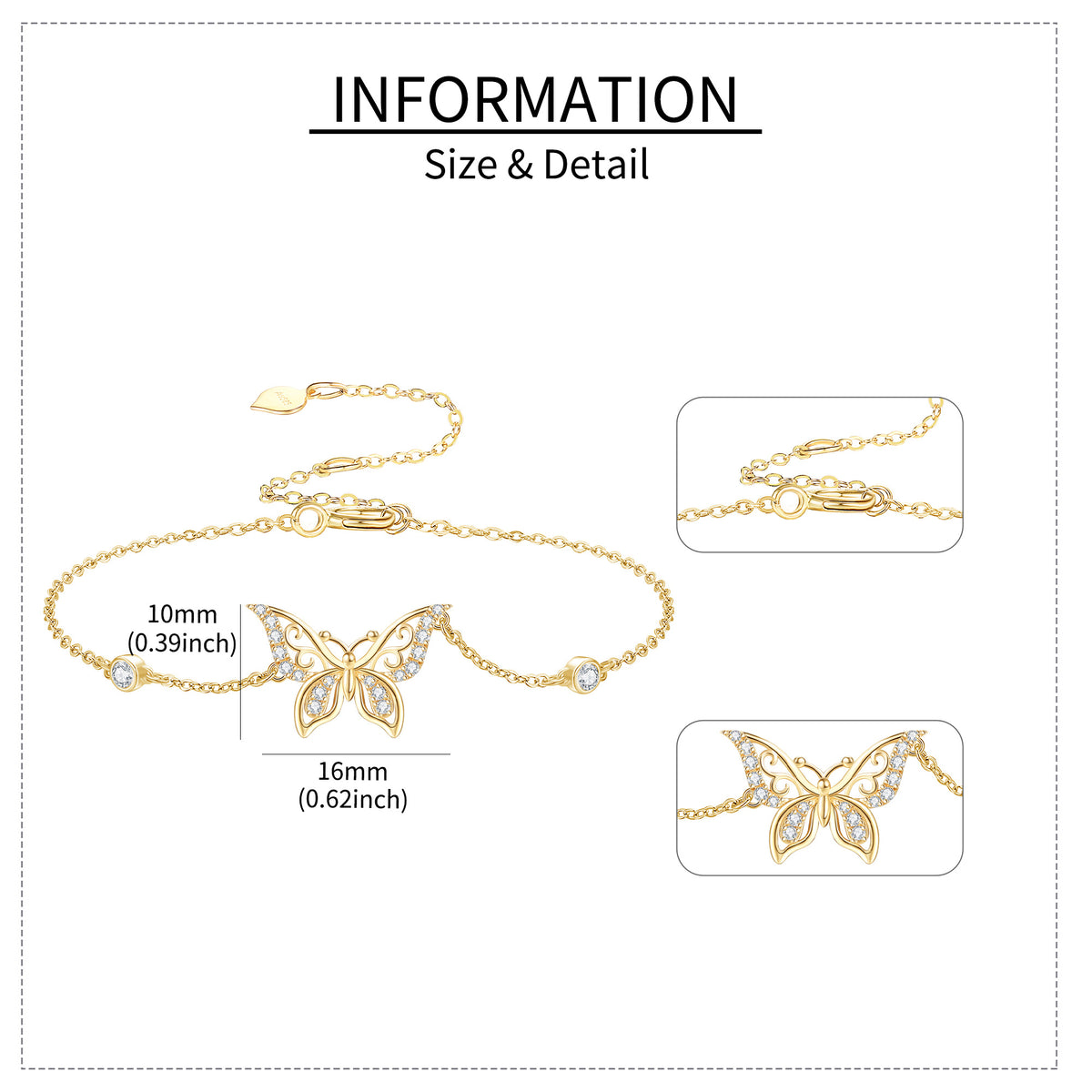This 14K Gold Moissanite Butterfly Charm Bracelet by YFN is a dazzling and sophisticated accessory designed to elevate any look. Crafted from premium 14K gold, the delicate butterfly motif, symbolizing transformation and beauty, is adorned with radiant Moissanite stones. These stones provide exceptional brilliance and fire, rivaling that of traditional diamonds. This lightweight yet durable charm bracelet is perfect for both everyday elegance and special occasions, capturing the essence of femininity and grace.