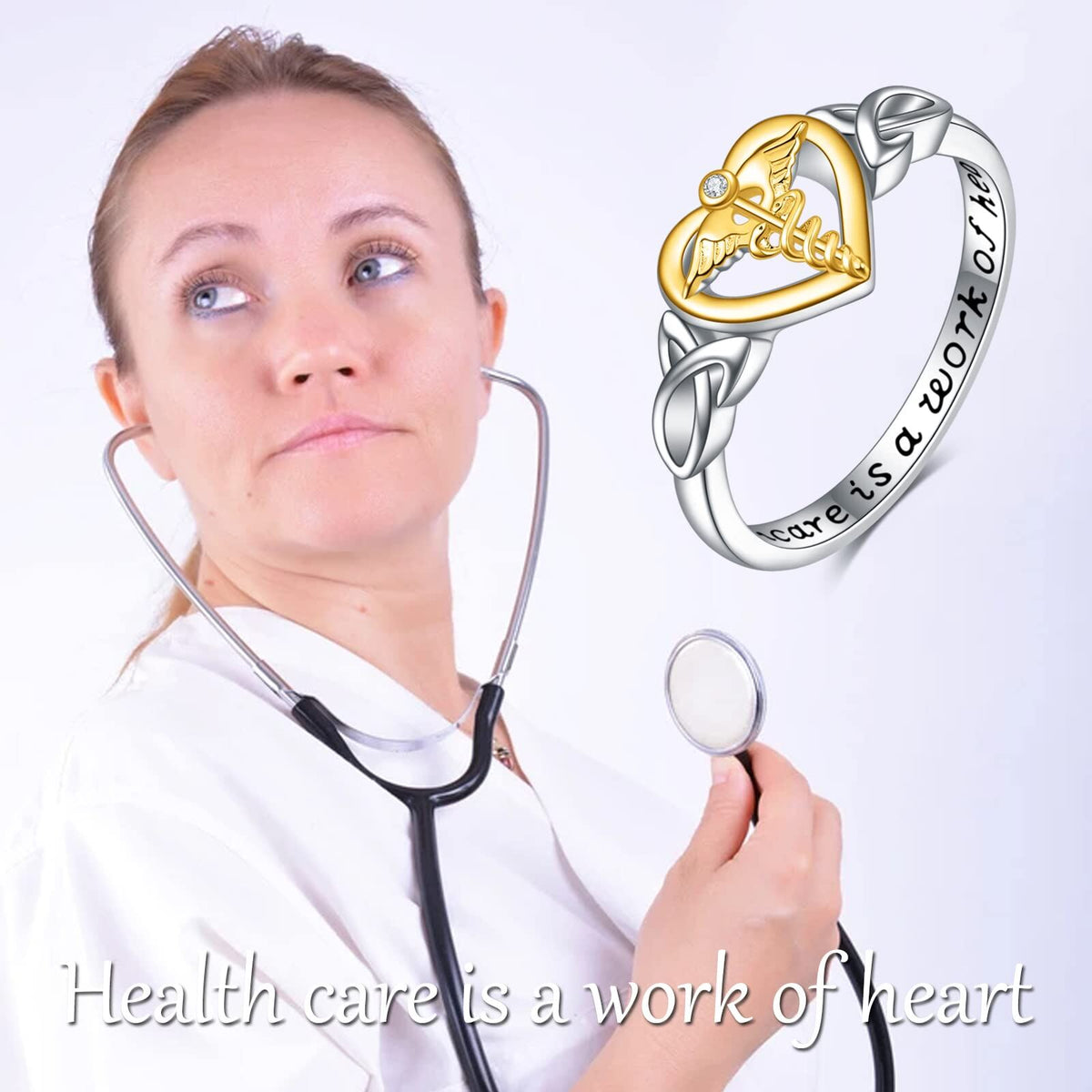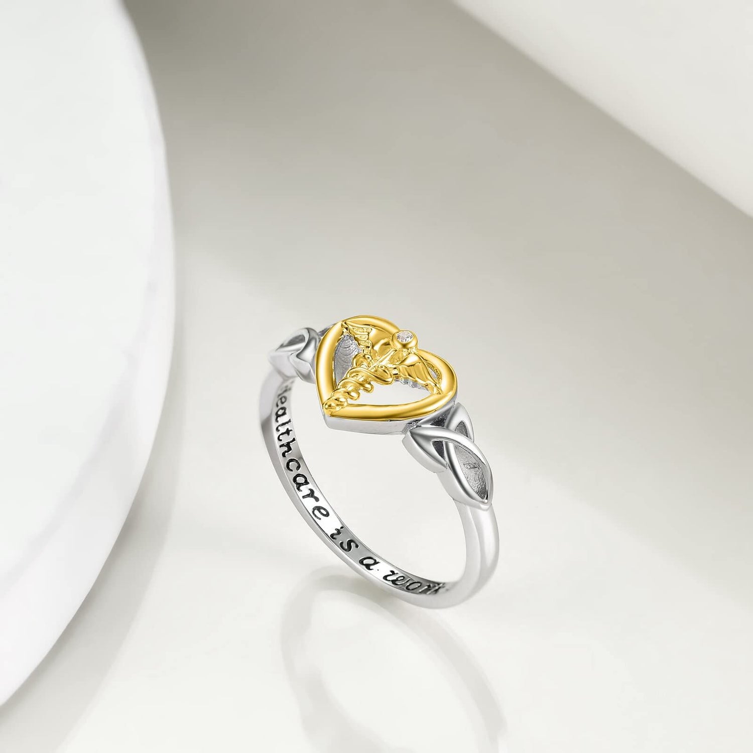 This no-stone Women's Ring is crafted from Sterling Silver with Two-tone (White and Yellow Gold) Plating, featuring an Angel Wing & Heart Design and the Engraved Word "Health Care Is A Work Of Heart."
