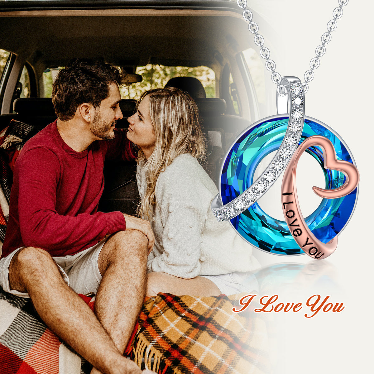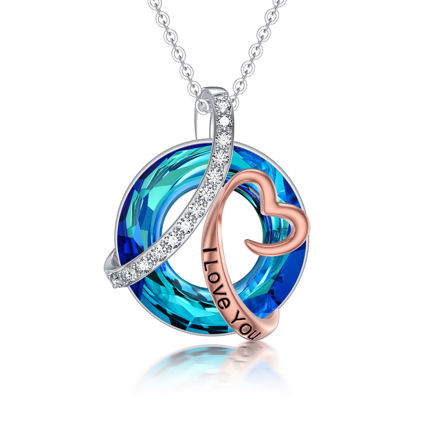 This Circular Shaped Pendant Necklace is crafted from 14K Gold with Silver & Rose Gold accents, featuring a Crystal Pendant and a Heart-Shaped Charm inscribed with "I Love You."