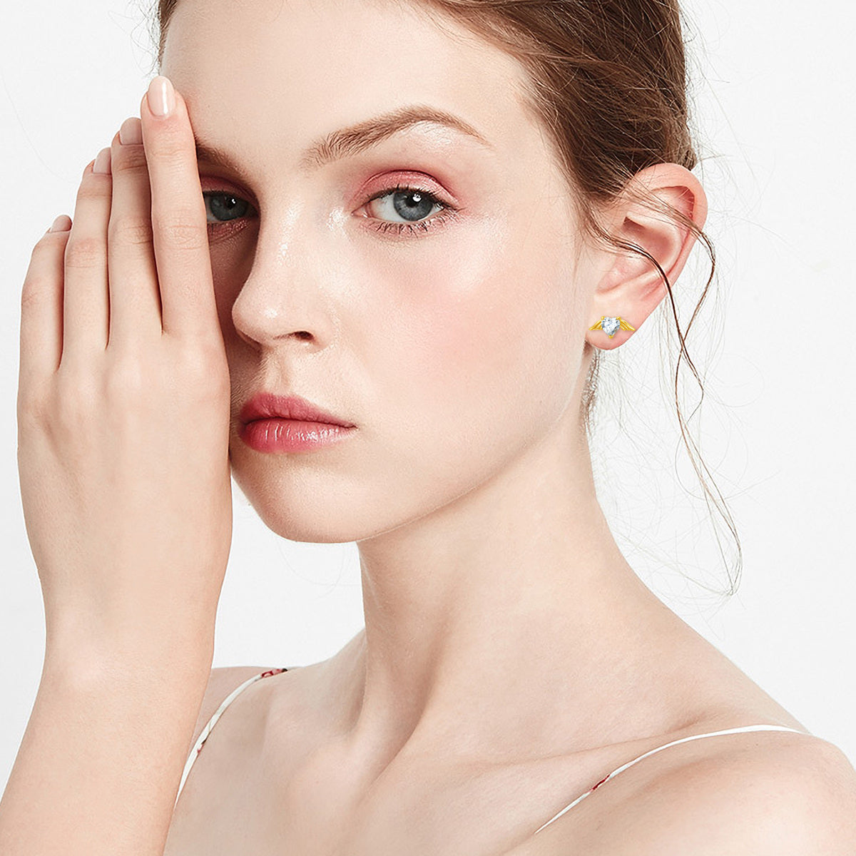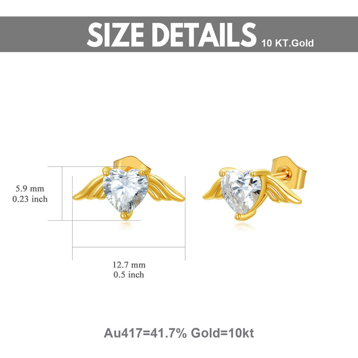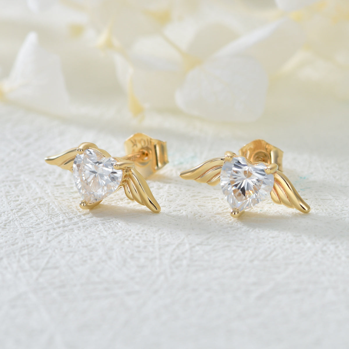 10K gold; moissanite; angel wing stud earring design.