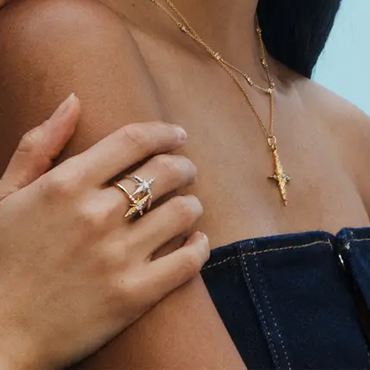 This Cubic Zirconia Star Ring by YFN draws inspiration from the night sky, offering an elegant piece with celestial charm and modern sophistication. The dazzling star design, set with brilliant cubic zirconia, is enhanced by the luxurious yellow gold plating, creating a radiant glow. This ring is a must-have accessory for the woman seeking to elevate her style with grace and allure. Its sleek design makes it perfect for wearing alone as a sophisticated statement or stacking with other pieces for a bolder look.