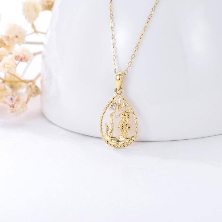 Crafted from high-quality 14K Gold, this Pendant Necklace features intricately designed Seahorses and Starfish adorned with sparkling Cubic Zirconia.
