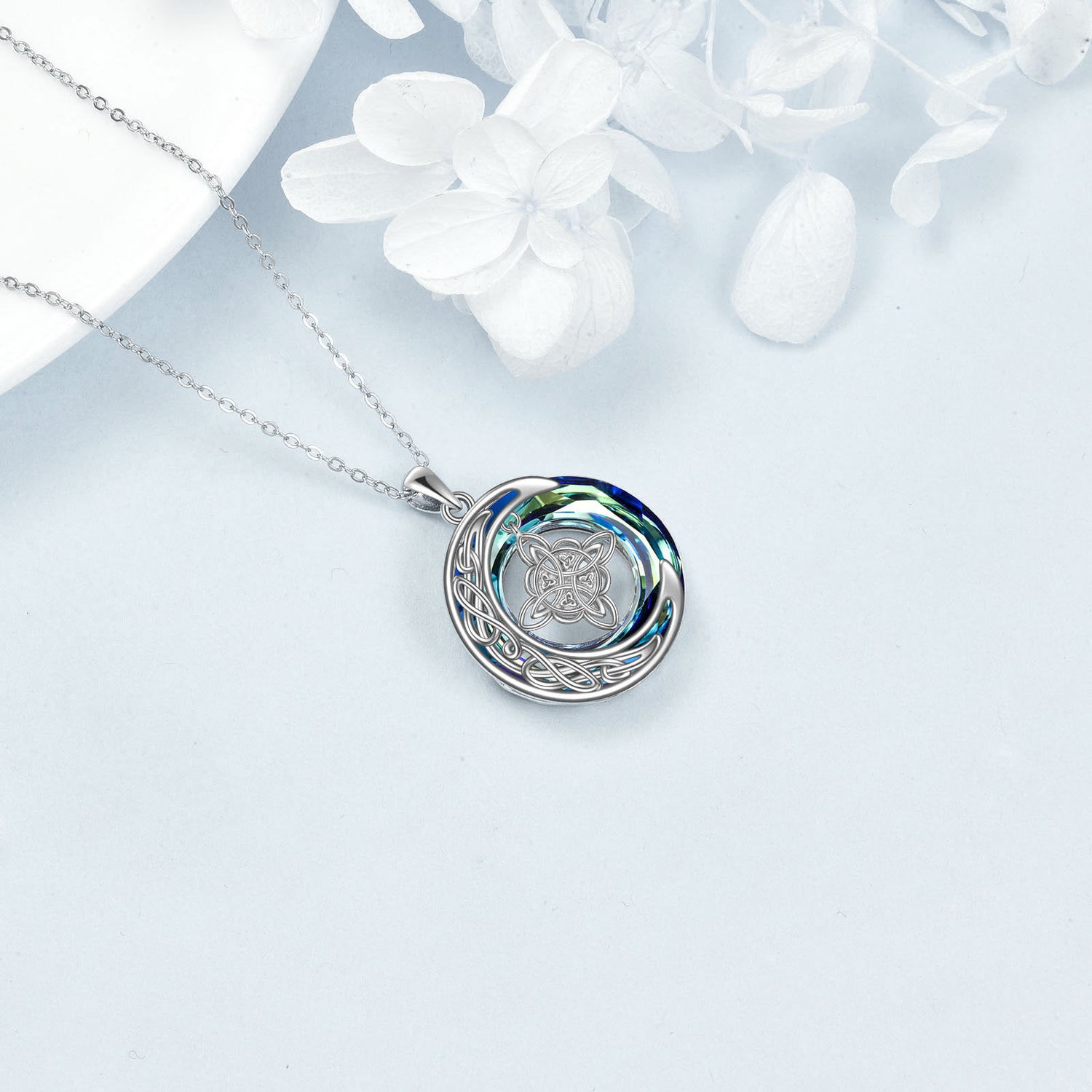 Crafted from Sterling Silver with White Gold Plating. This is a Round Pendant Necklace featuring Celtic Knot & Moon motifs, set with Blue Crystal stone.