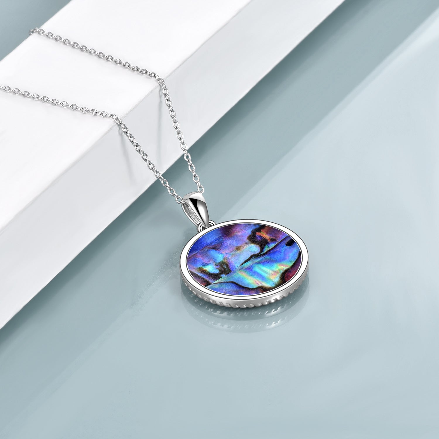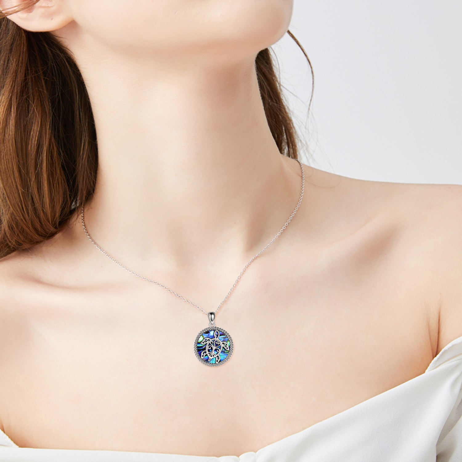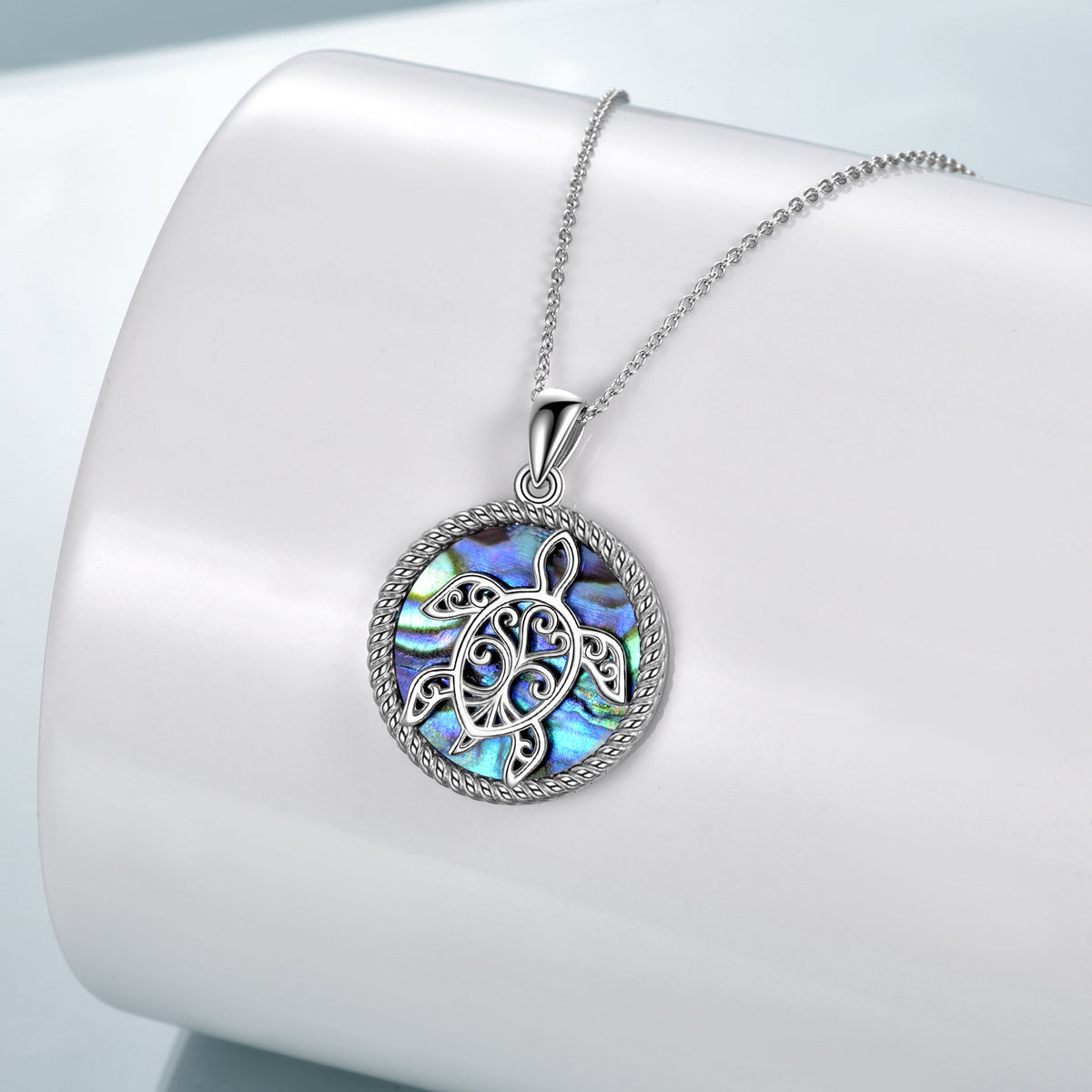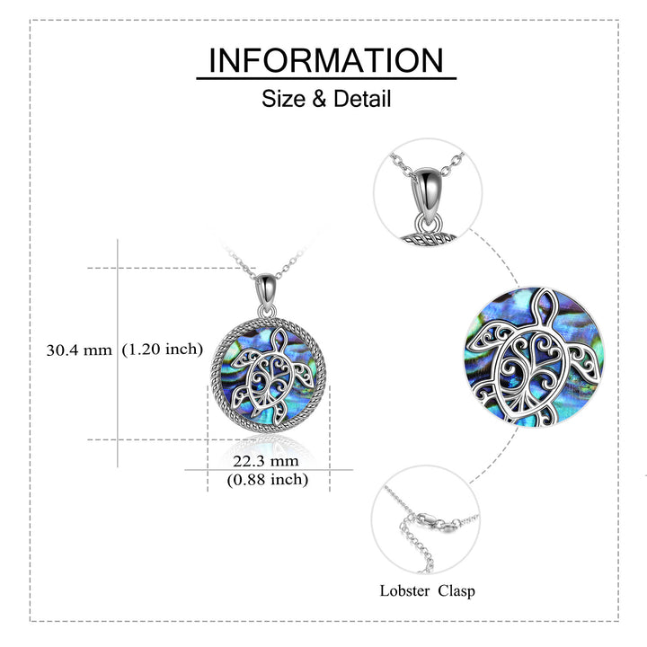 Crafted in sterling silver with abalone shellfish inlay in a sea-turtle design. Retro silver finish. Includes sterling silver chain; standard pendant and chain measurements per YFN.