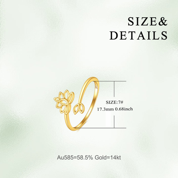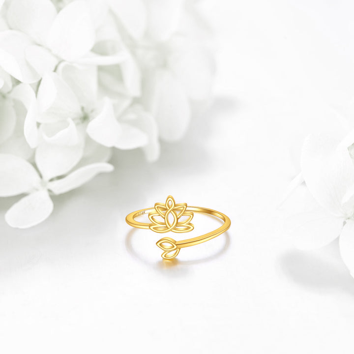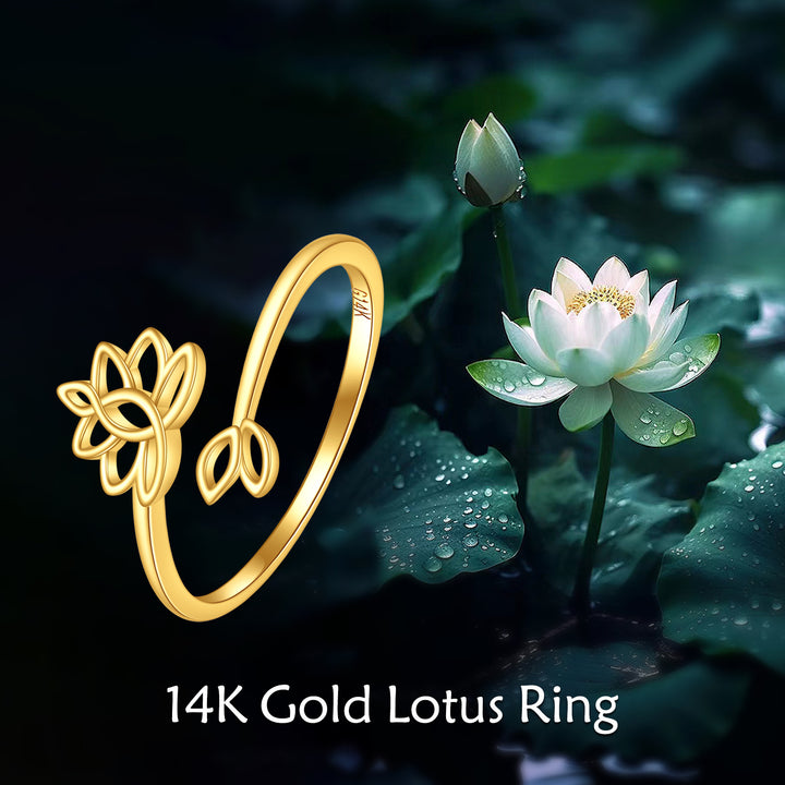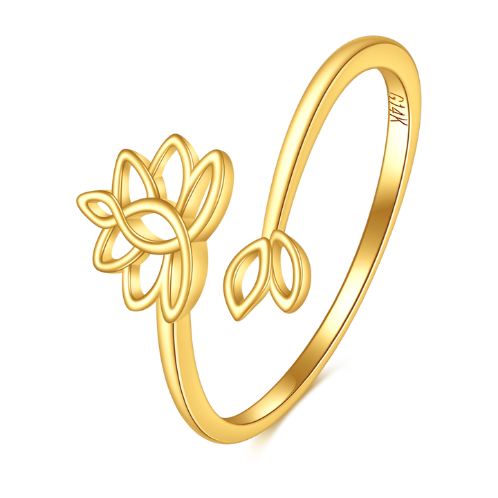 Crafted from solid 14K gold featuring a stone-free lotus motif in an open, adjustable ring design.
