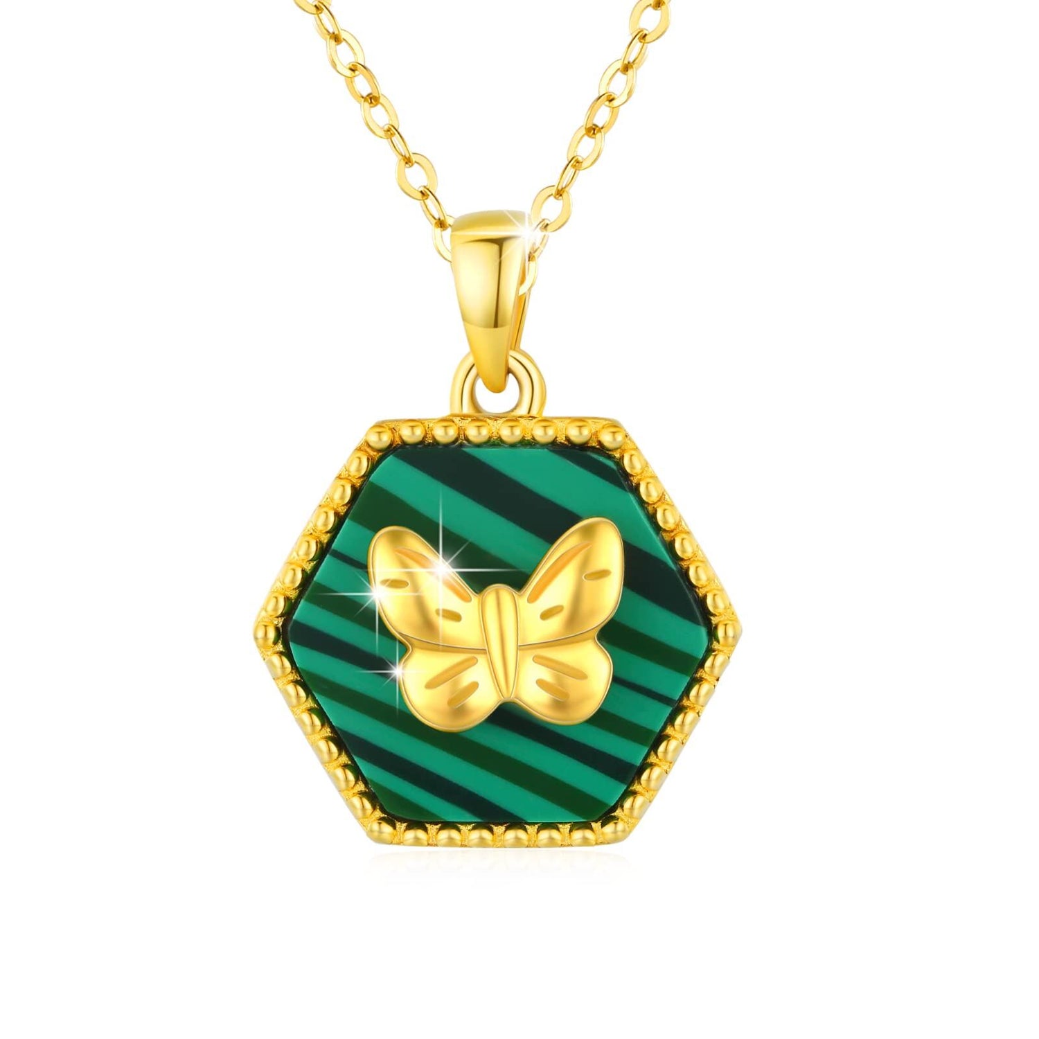 This Sterling Silver with Yellow Gold Plated Five-Pointed Star Shaped Malachite Butterfly Pendant Necklace by YFN blends symbolism, elegance, and artistic beauty into a striking accessory for women. The star-shaped silhouette represents hope and guidance, while the rich green malachite adds grounding energy and natural allure. A delicate butterfly accent symbolizes transformation and grace, creating a harmonious balance of meaning and style. Finished in radiant yellow gold plating, the pendant offers a luxurious sheen that pairs beautifully with both modern and classic outfits. This necklace makes a captivating statement for women who appreciate unique, storytelling jewelry.