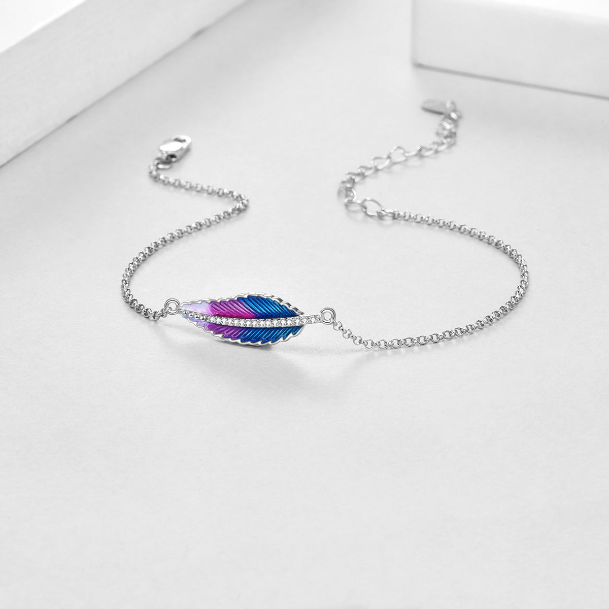 Crafted in sterling silver with white gold plating featuring circular cubic zirconia charm and feather motif. Standard bracelet clasp.