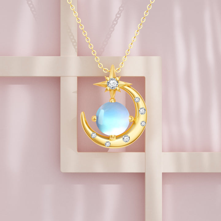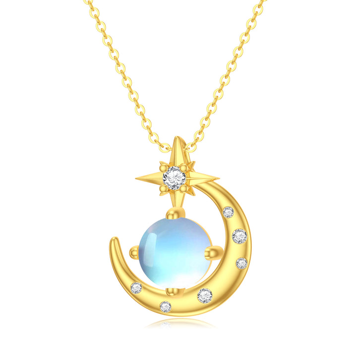 14K Gold Cubic Zirconia Moonstone Moon And Star Pendant Necklace For Women