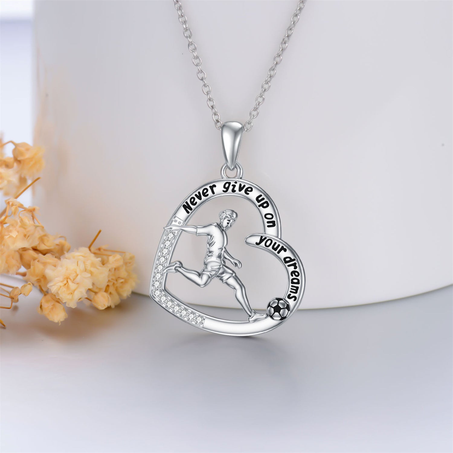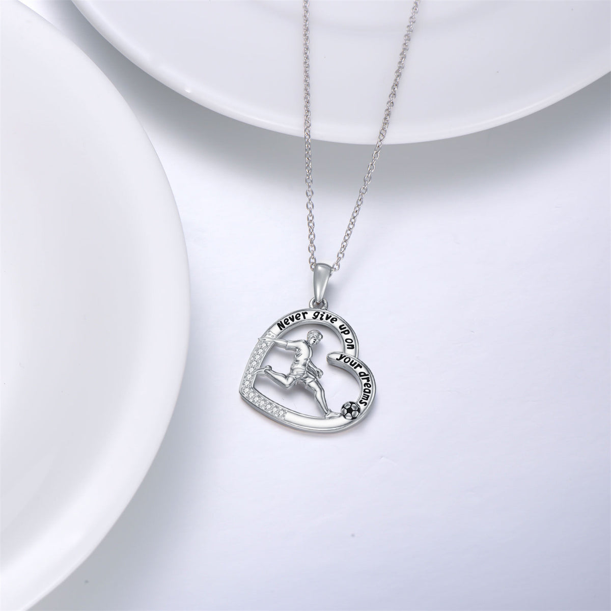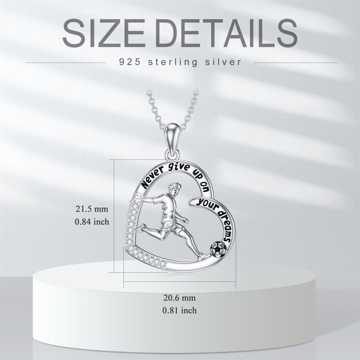 This Sterling Silver Round Cubic Zirconia Football and Heart Pendant Necklace by YFN inspires confidence and perseverance through its heartfelt symbolism and radiant sparkle. Designed as a unisex piece, it features a brilliant round cubic zirconia framed by both football and heart motifs, celebrating passion, dedication, and love for the game. Enhanced with a polished white gold plated finish, the pendant gleams beautifully while displaying the empowering inscription “Never Give Up On Your Dreams.” A meaningful gift or personal keepsake, it serves as a daily reminder to pursue ambition with courage and heart.