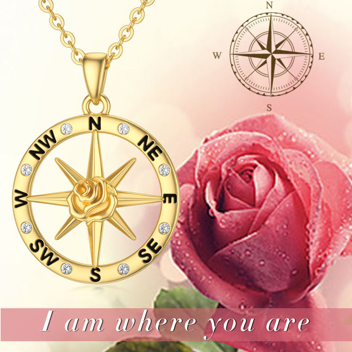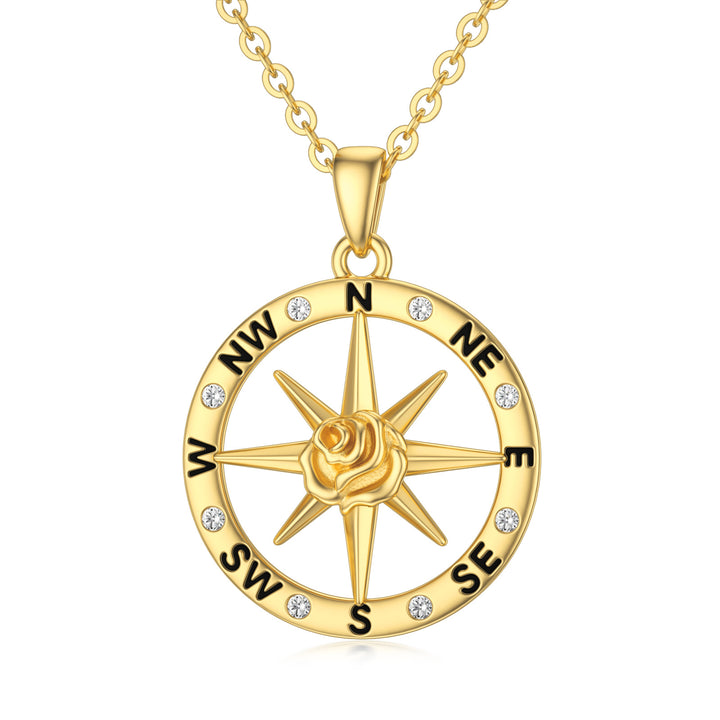 9K Gold Round Zircon Rose & Compass Pendant Necklace