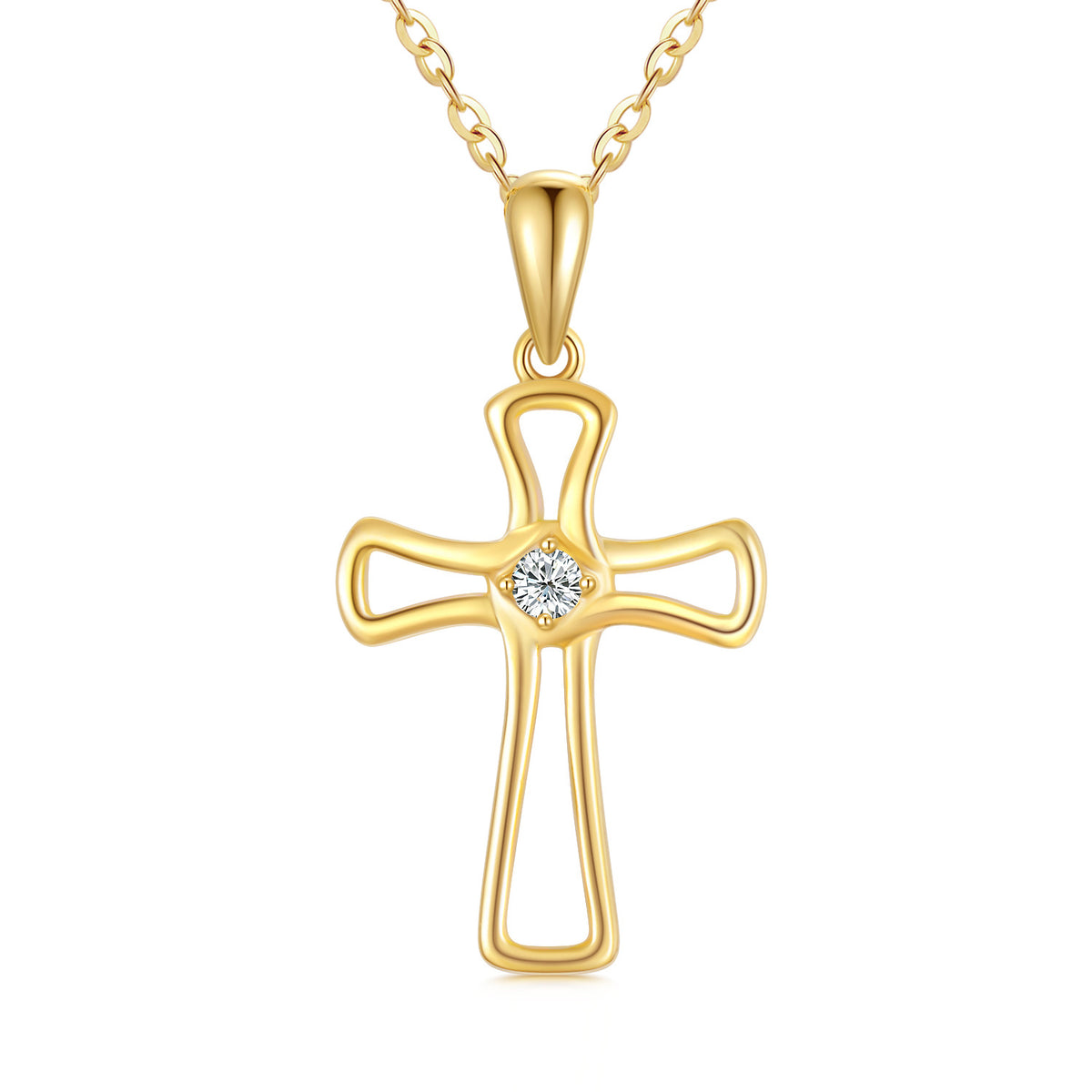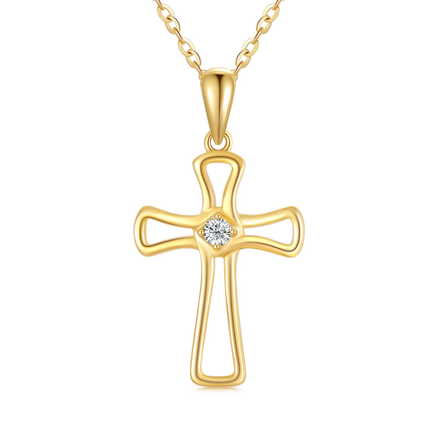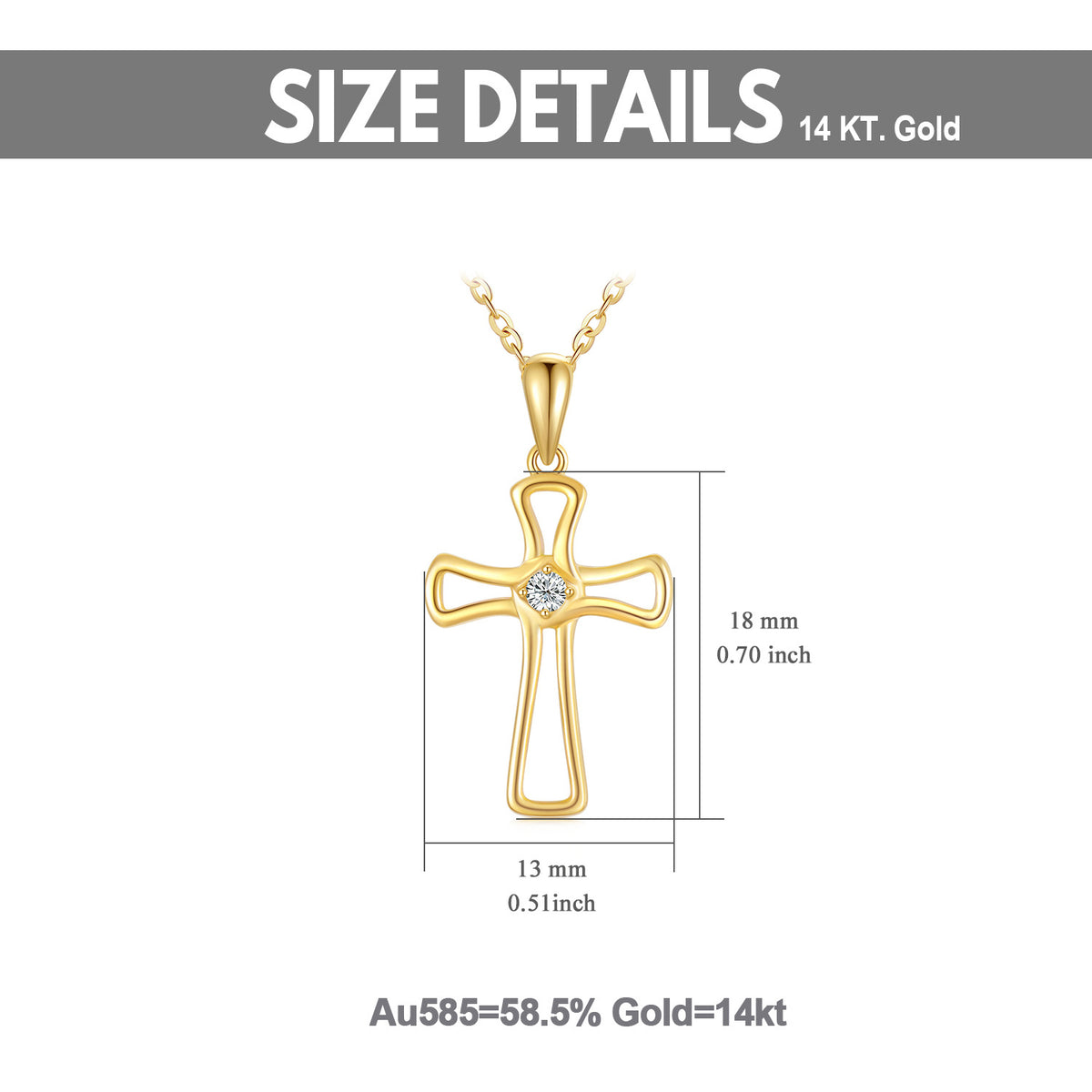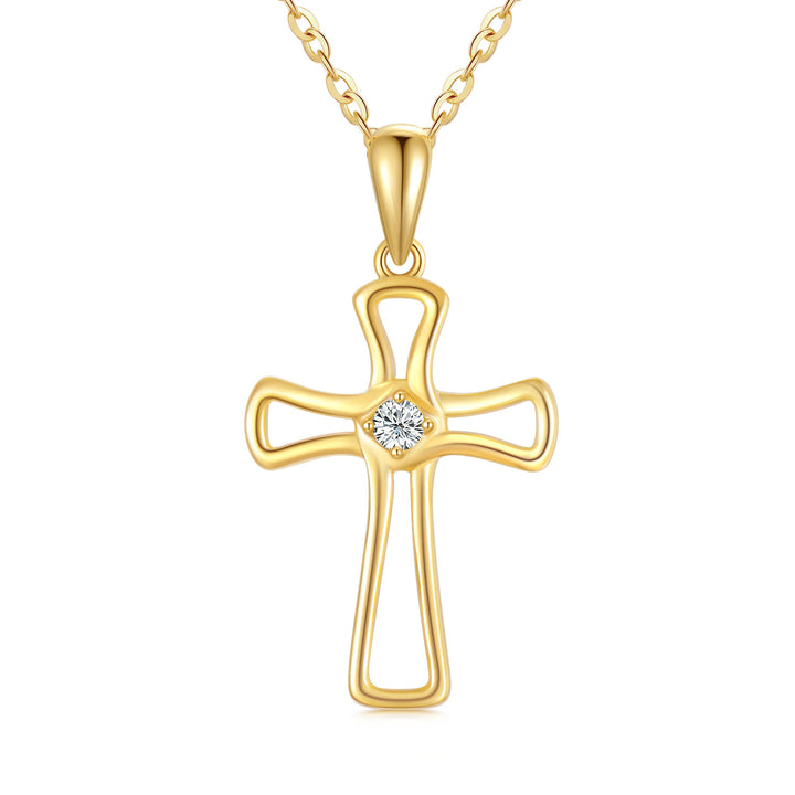 This pendant necklace is crafted from solid 14K Gold and features a cross motif set with brilliant-cut Moissanite gemstones, suspended from a gold chain.