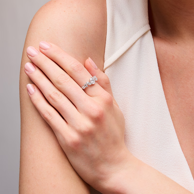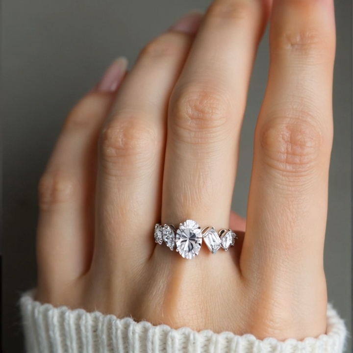 This Oval Princess Lab Created Diamond Custom Wedding Ring by YFN is a testament to timeless commitment and tailored luxury. Its elegant vintage style features a stunning oval center stone flanked by princess cuts, creating a captivating visual harmony. Symbolizing the enduring purity and brilliance of your love, this ring is an ideal choice for a modern bride seeking classic elegance with personalized significance. Its exceptional polish and symmetry ensure a luminous presence, making it a distinctive and cherished expression of your unique story.