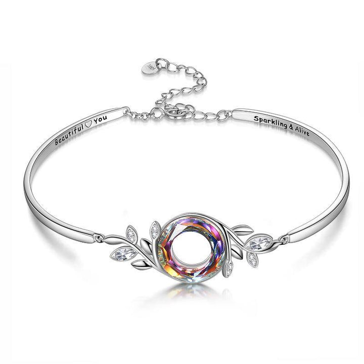 Sterling Silver Crystal Leaves Pendant Bangle Bracelet