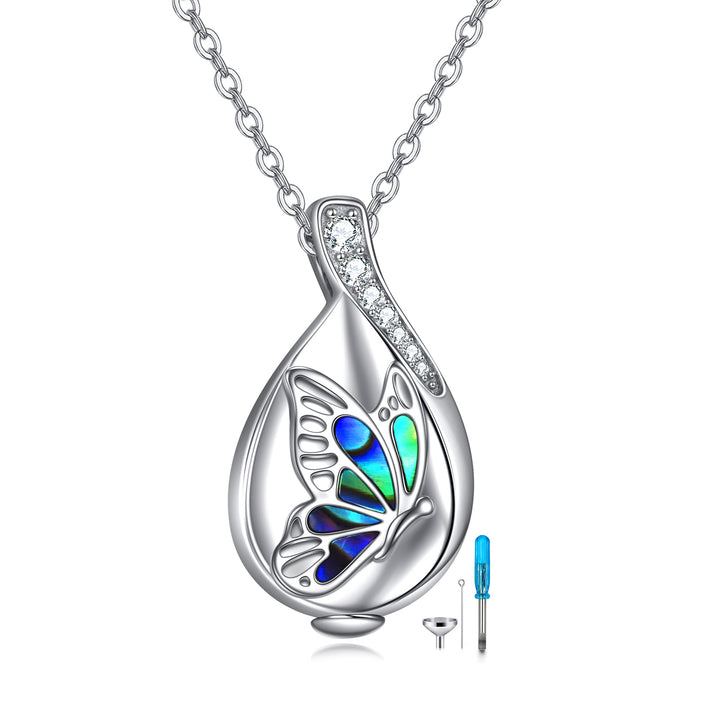 Sterling Silver Abalone Shellfish & Cubic Zirconia Butterfly Urn Necklace for Ashes