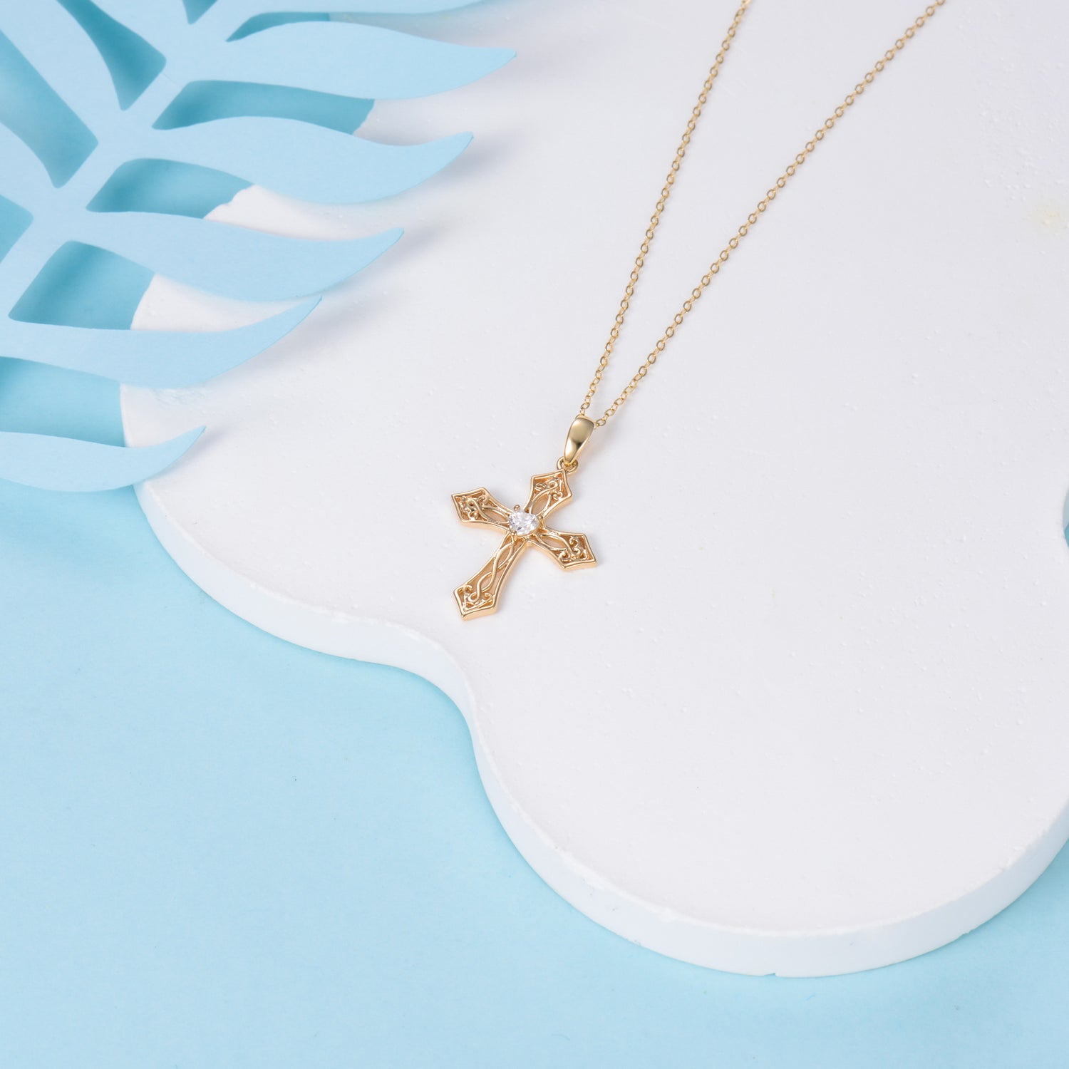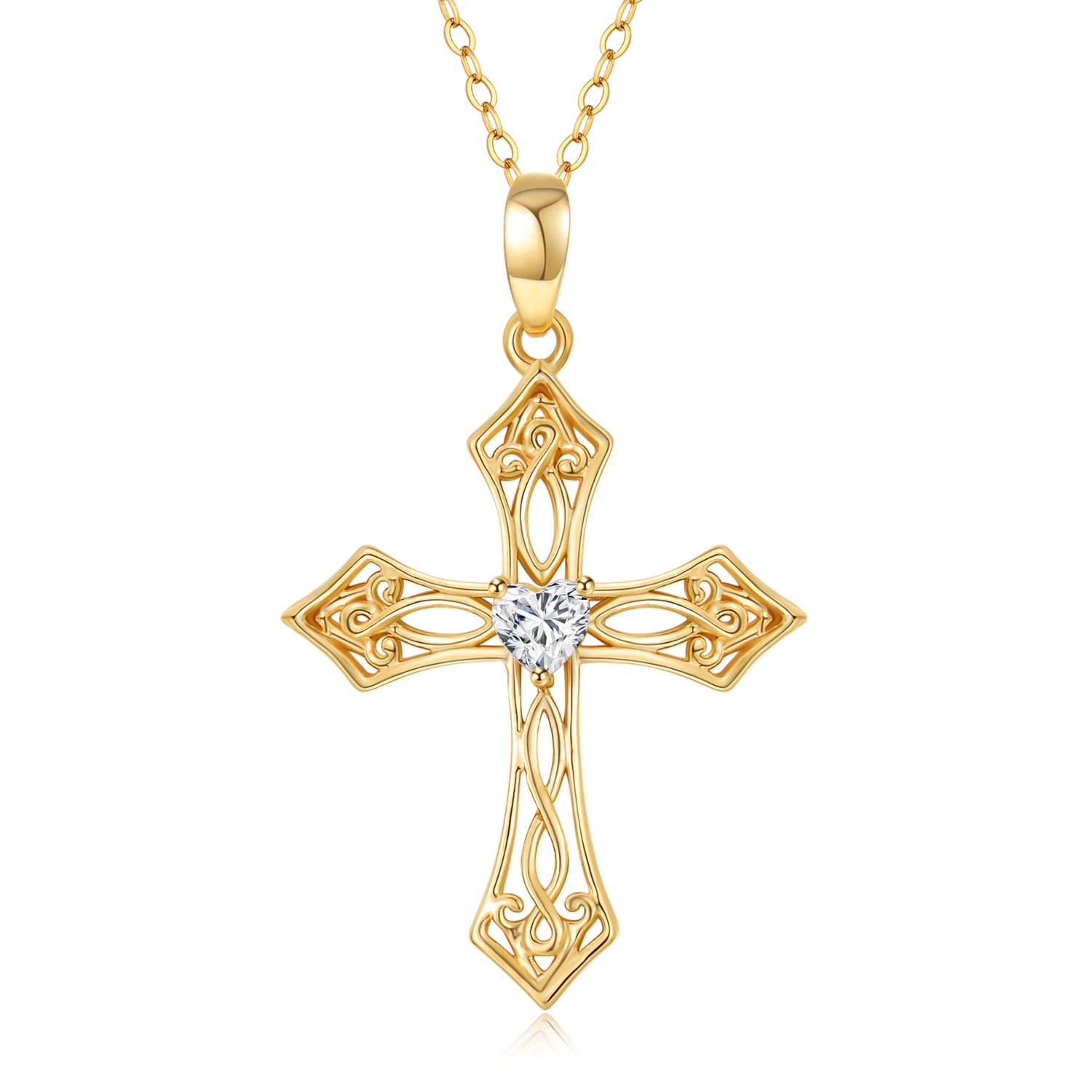 14K Gold Heart Shaped Cubic Zirconia Cross Pendant Necklace