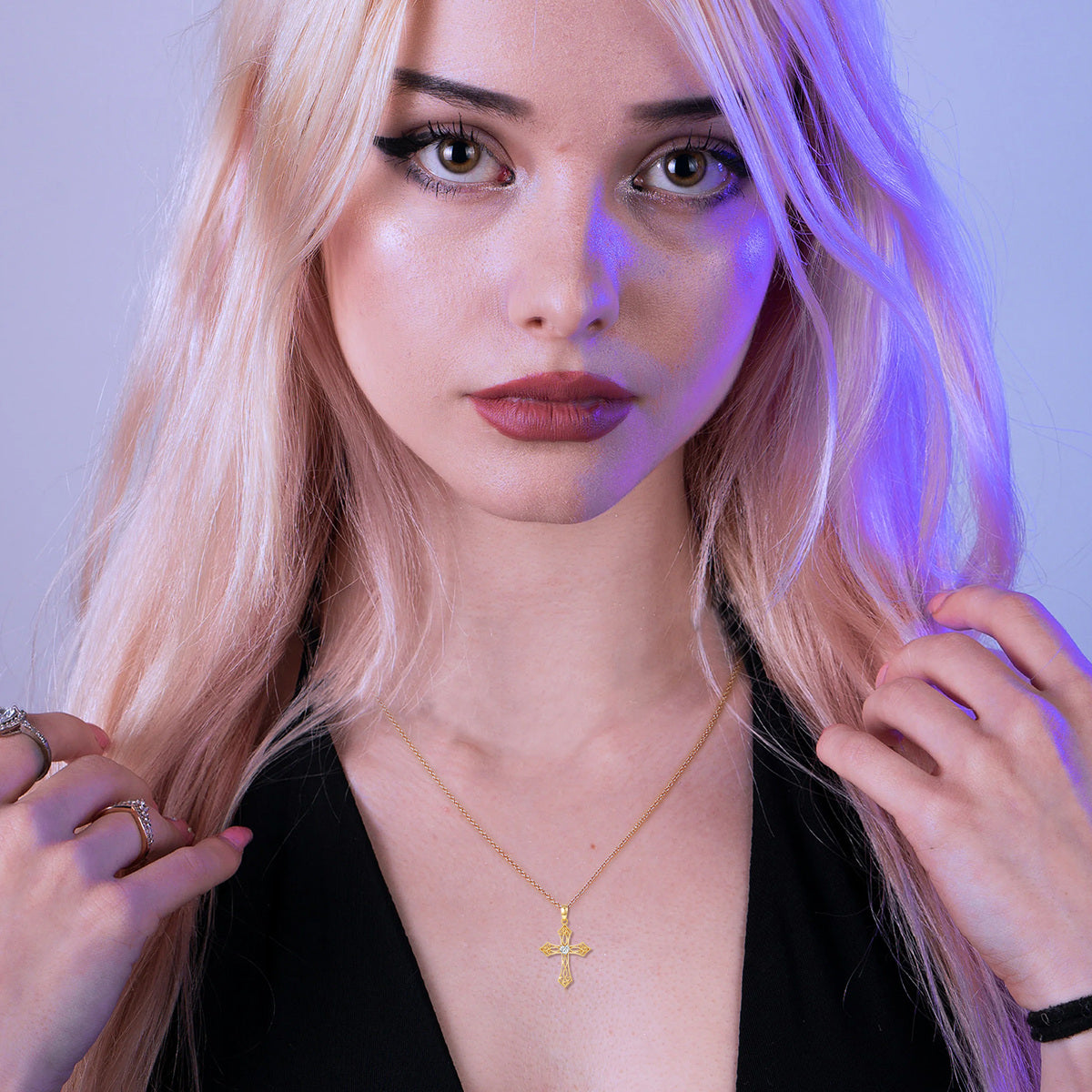 This Women's Pendant Necklace is plated in 14K Gold, featuring a Heart Shaped Cross Design Adorned with Sparkling Cubic Zirconia.
