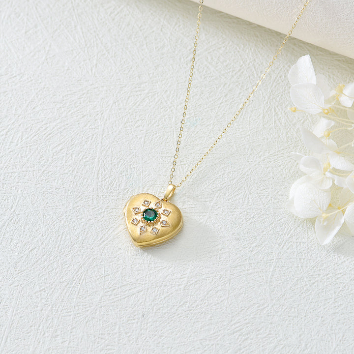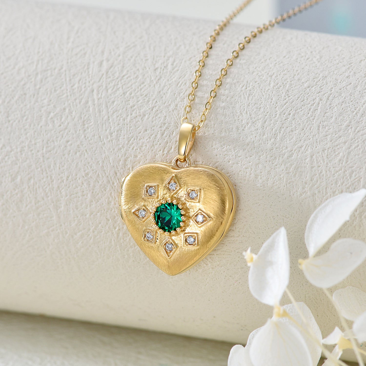 9K gold. Cubic zirconia accents. Emerald centerpiece. Circular photo locket design.