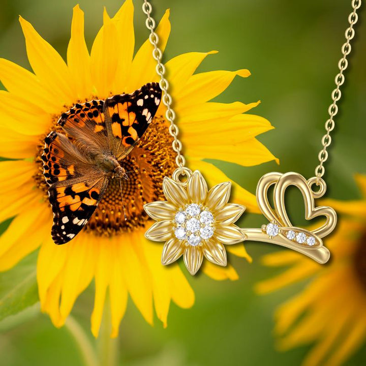 14K gold; moissanite stones; butterfly and sunflower motifs; gold chain.