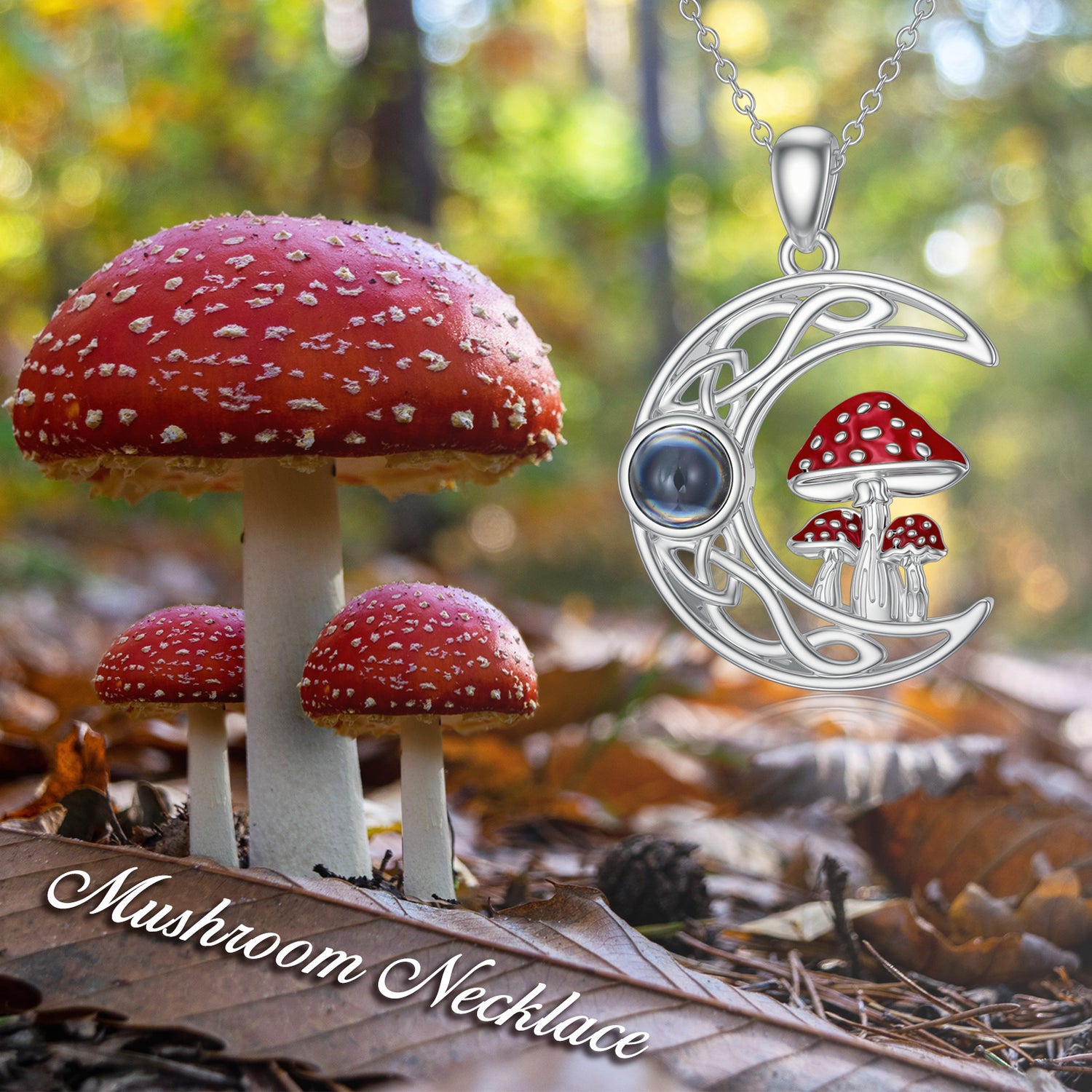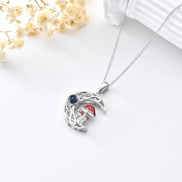 Sterling Silver Circular Projection Stone Mushroom & Celtic Knot Moon Pendant Necklace With Engraved Word For Women