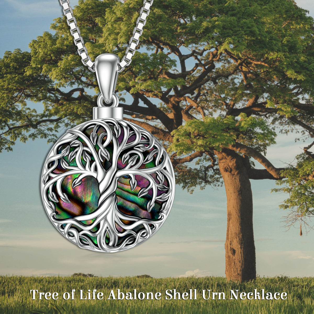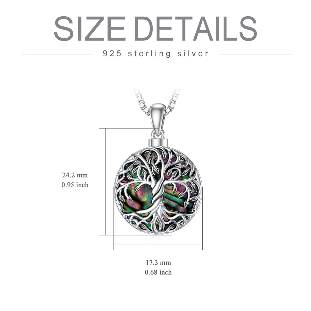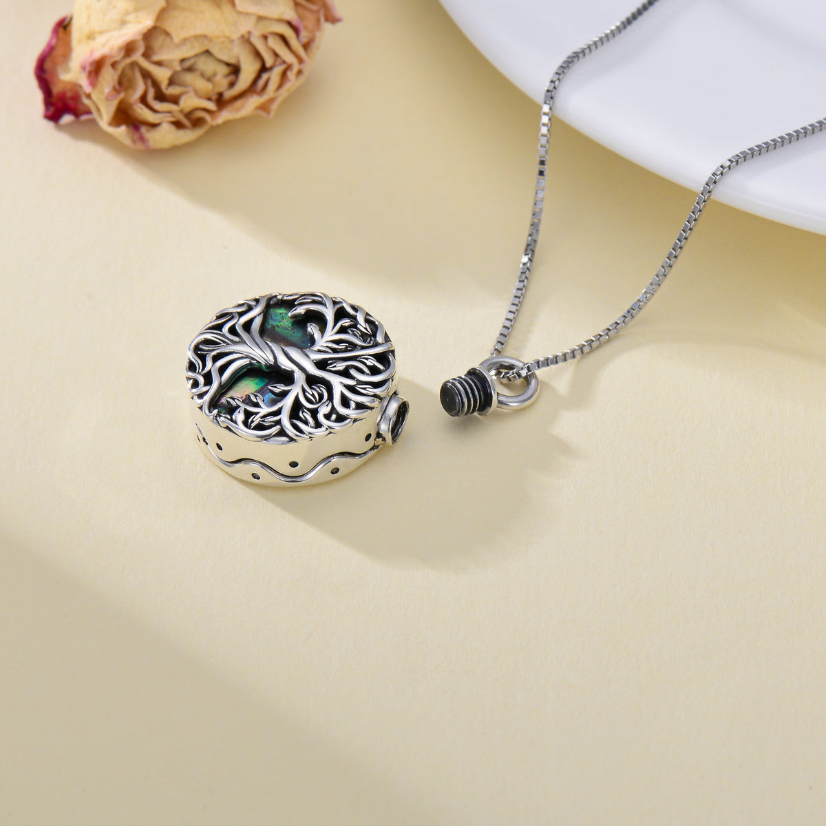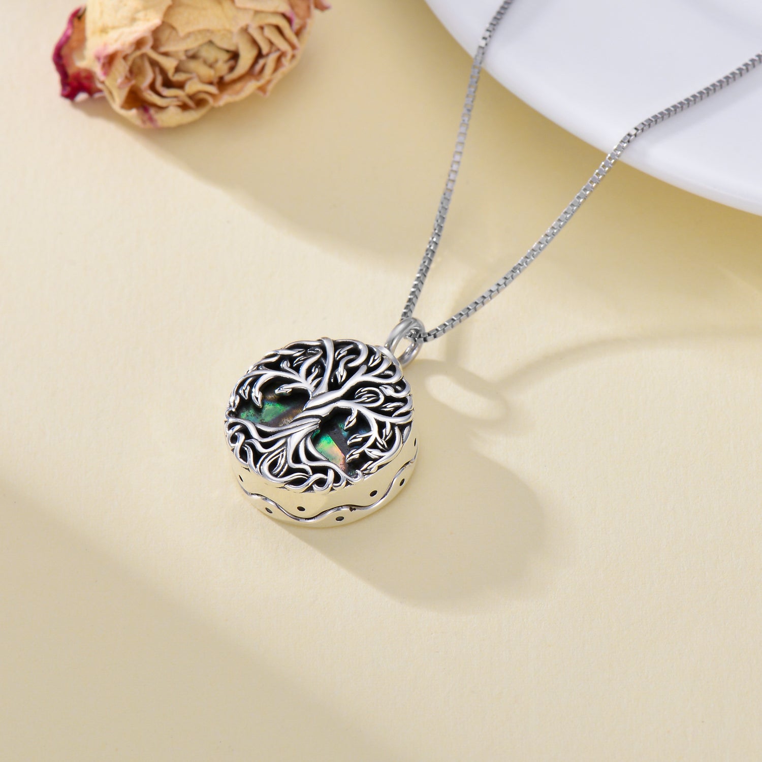 This Urn Necklace for Ashes is crafted from Premium Sterling Silver with a Retro Silver Finish, Adorned with Mesmerizing Abalone Shellfish and Featuring a Sophisticated Tree of Life Design.