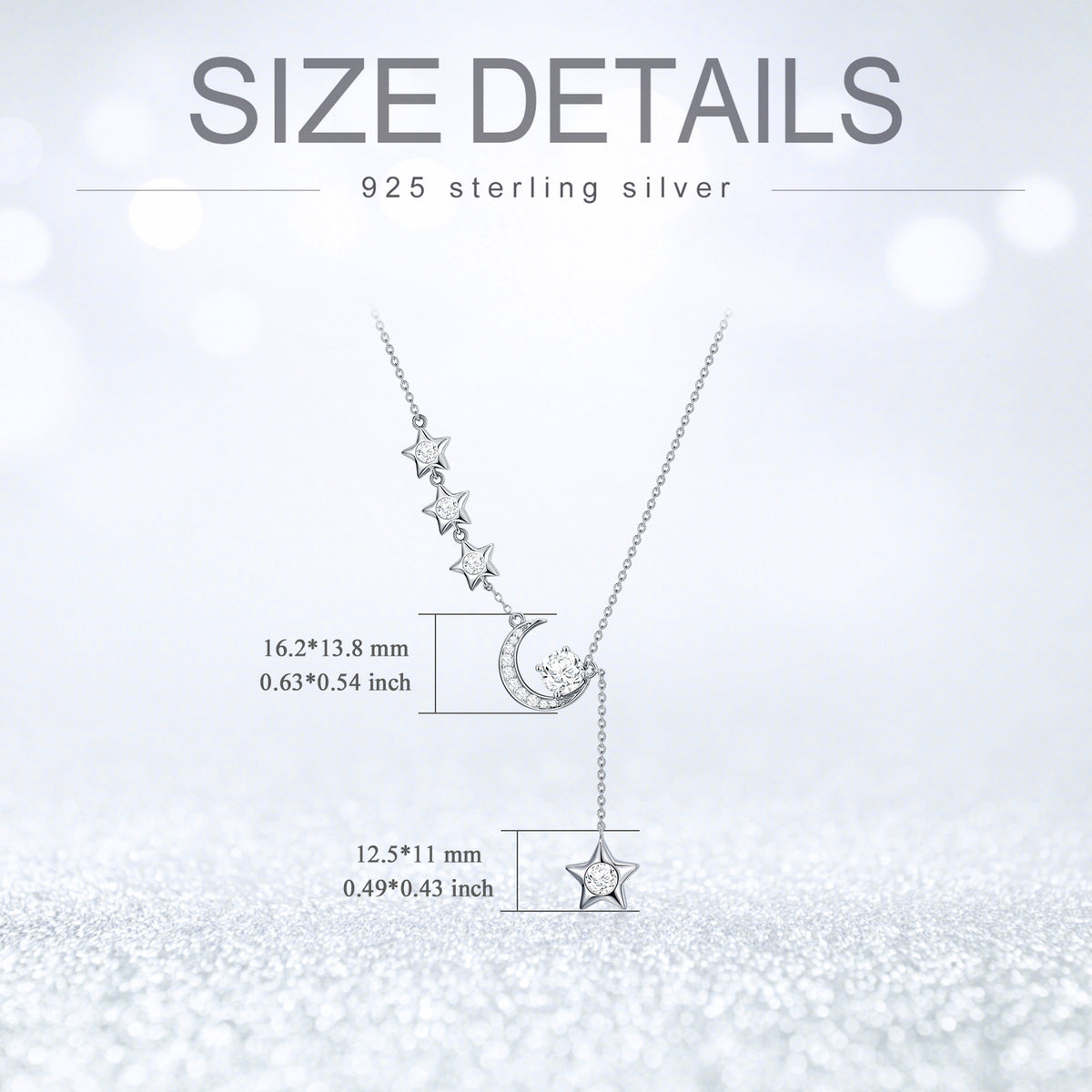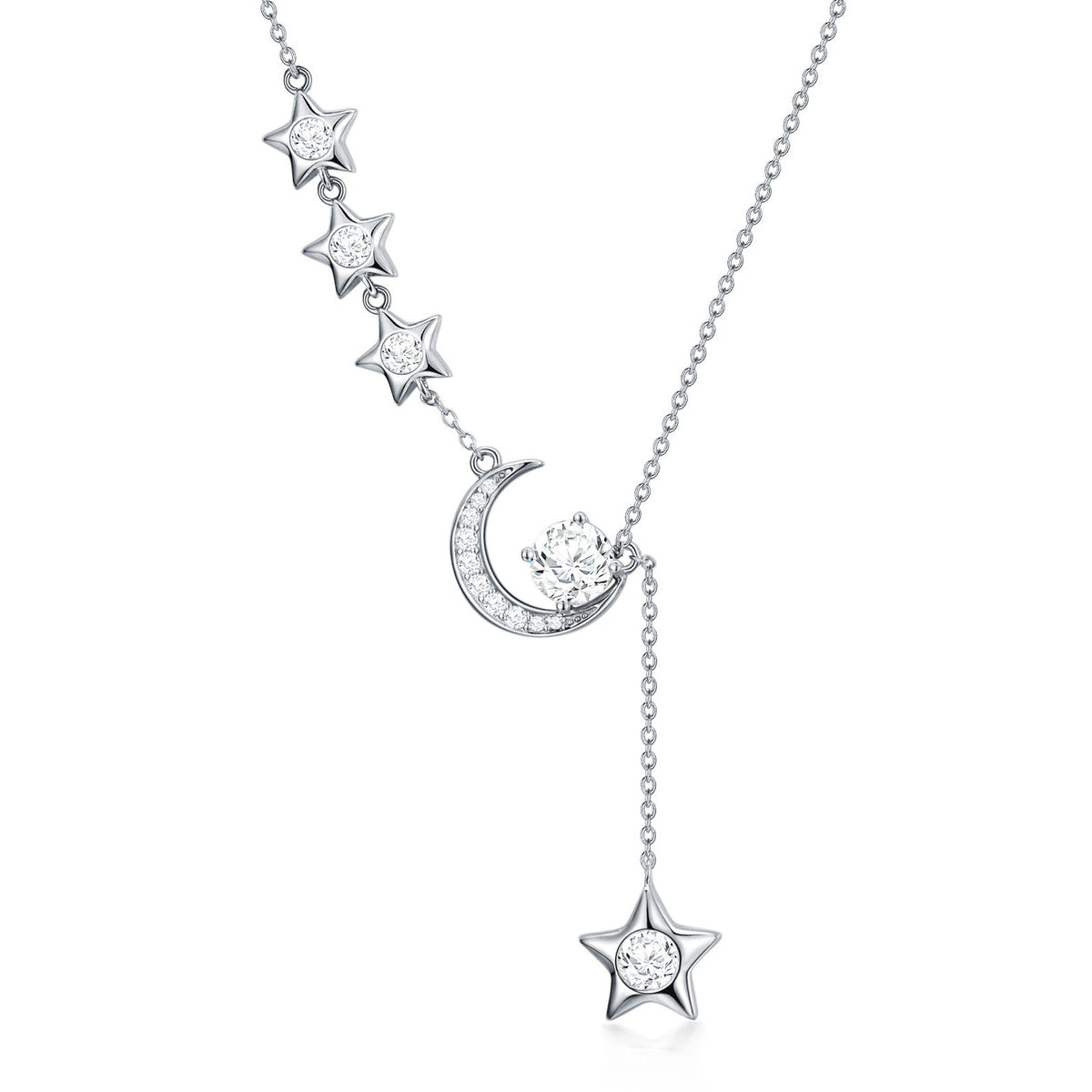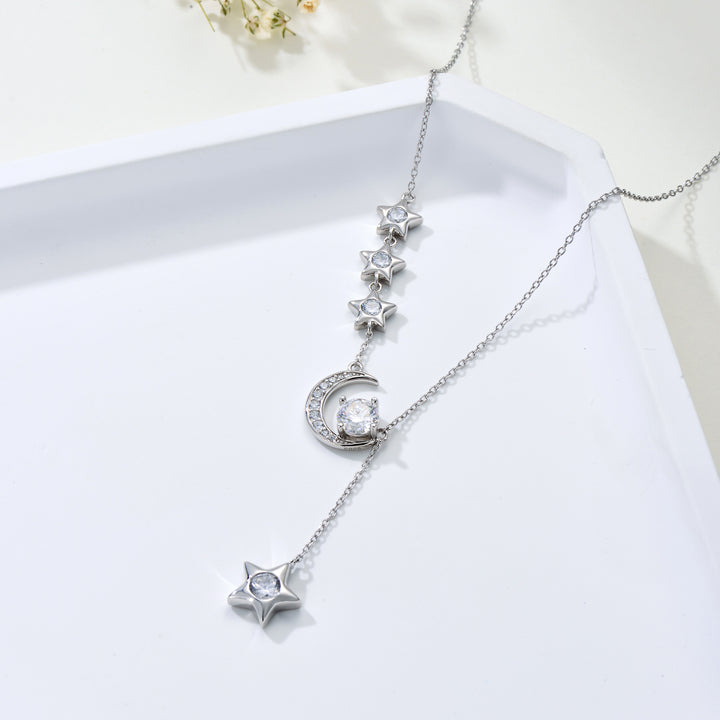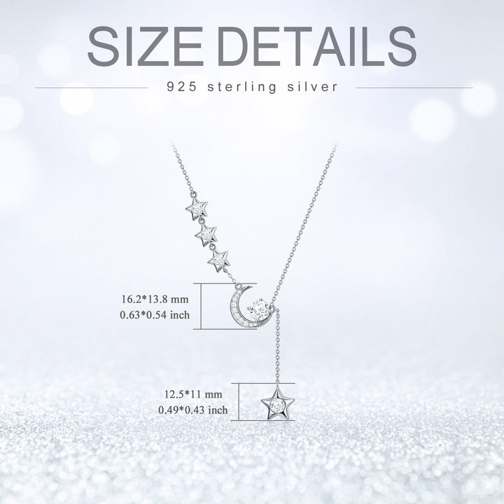 This Sterling Silver Round Moissanite Moon & Star Pendant Necklace by YFN is an elegant necklace for women, perfect for those who appreciate celestial charm and sophistication. Crafted from sterling silver and beautifully plated in white gold, the round clear Moissanite gem serves as a stunning focal point, set within the enchanting motifs of the Moon and Star. This piece is an ideal choice for adding enduring elegance to a jewelry collection.