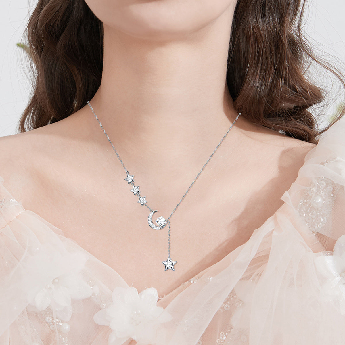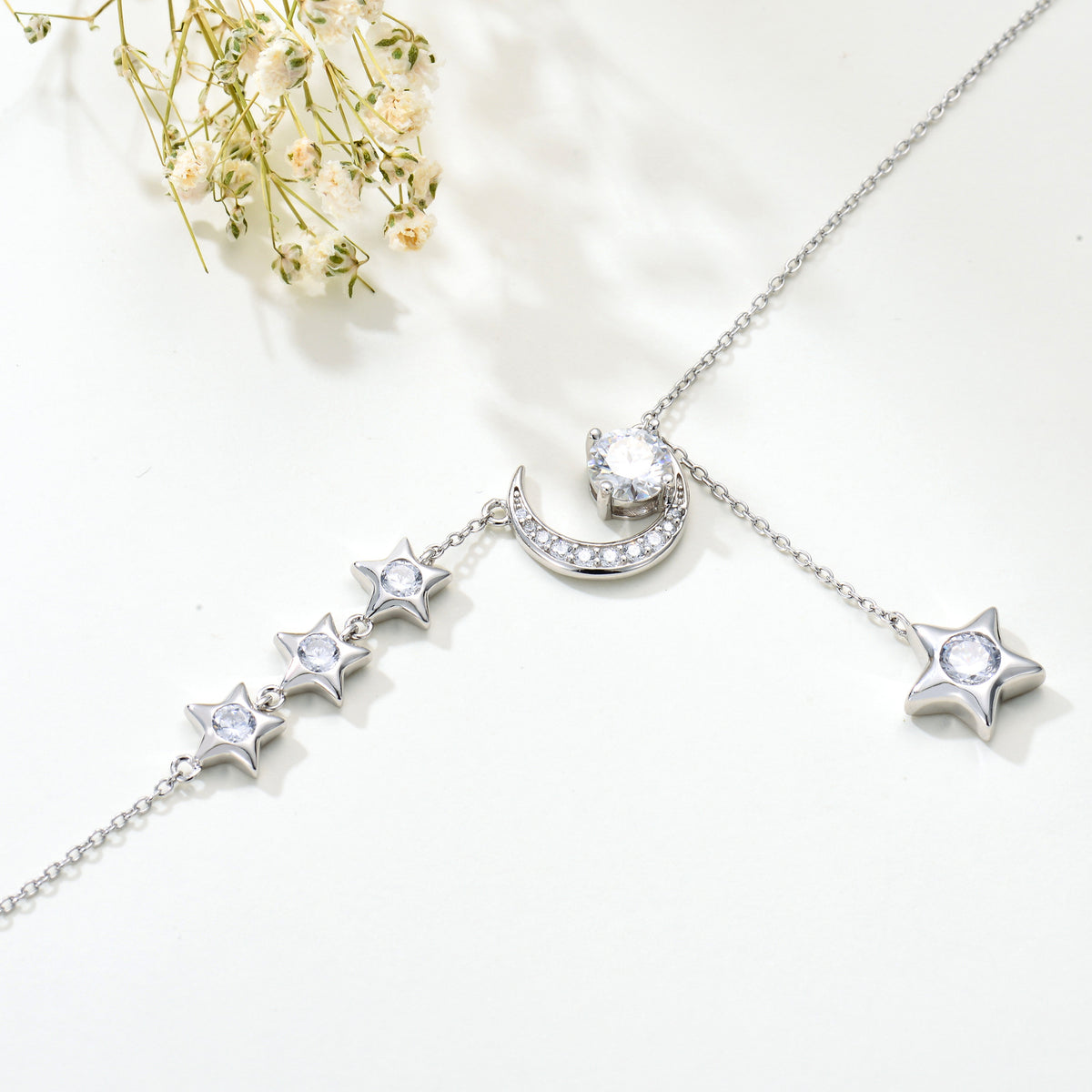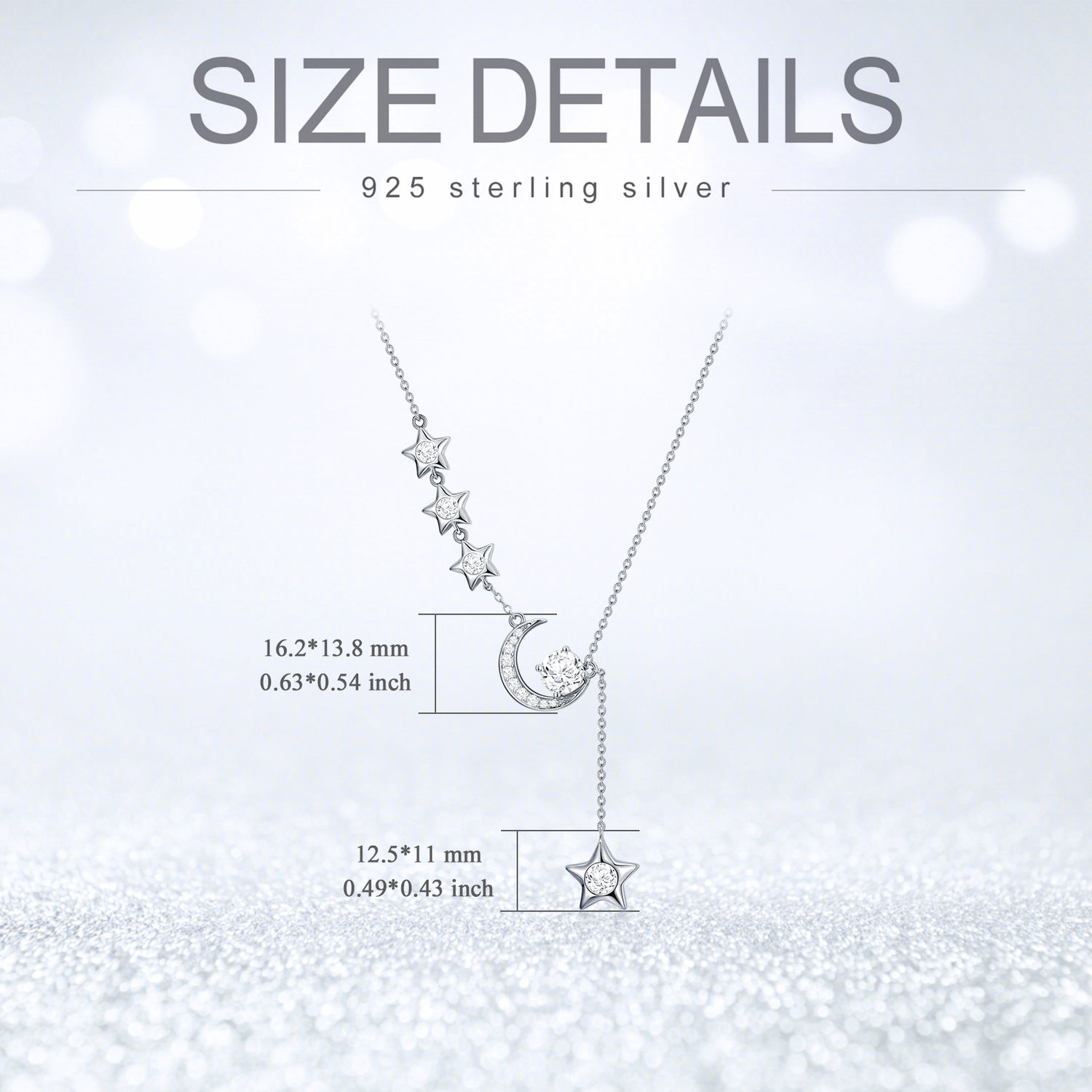 This Sterling Silver Round Moissanite Moon & Star Pendant Necklace by YFN is an elegant necklace for women, perfect for those who appreciate celestial charm and sophistication. Crafted from sterling silver and beautifully plated in white gold, the round clear Moissanite gem serves as a stunning focal point, set within the enchanting motifs of the Moon and Star. This piece is an ideal choice for adding enduring elegance to a jewelry collection.